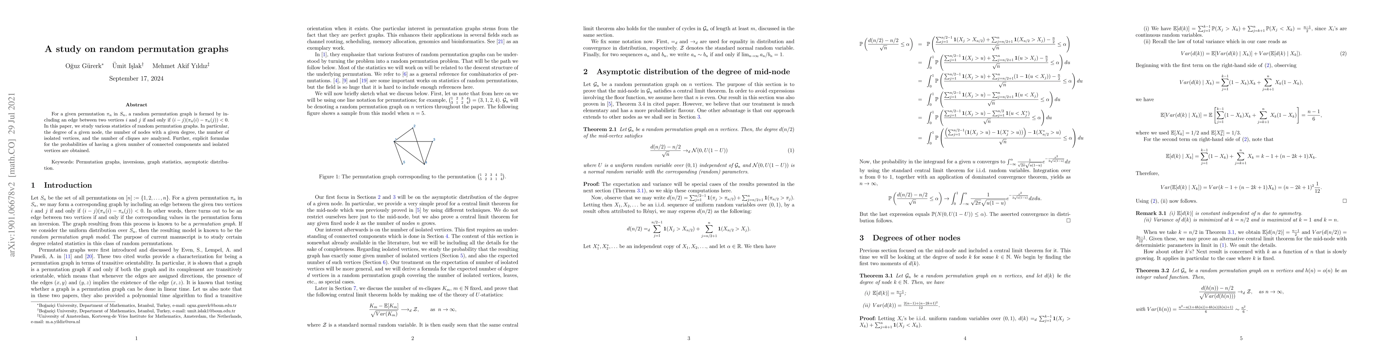 This paper investigates random permutation graphs formed by edges between vertices based on the sign of differences in their positions and permuted values, analyzing node degrees, isolated vertices, cliques, and connected components, and deriving explicit formulas for their probabilities.