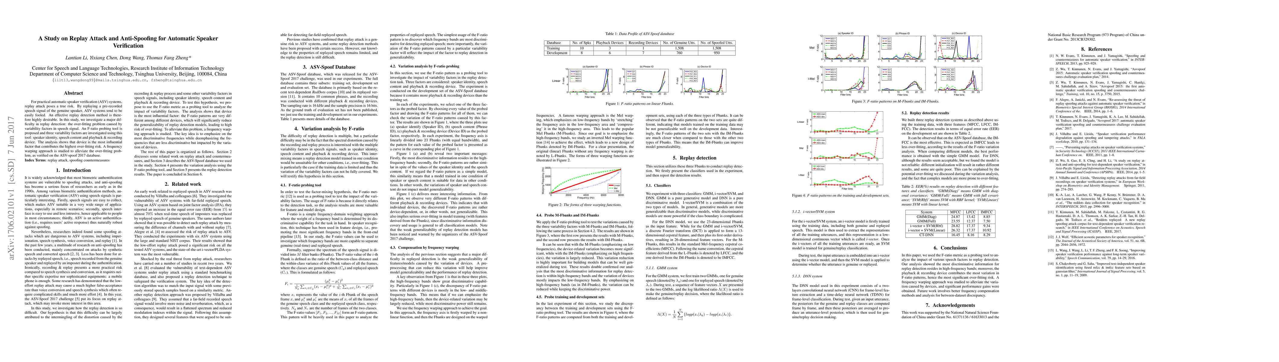 The study investigates replay attacks in automatic speaker verification (ASV) systems using the F-ratio probing tool to analyze variability factors like speaker identity, speech content, and playback & recording devices. It proposes a frequency warping approach to alleviate over-fitting risks caused by device variability, particularly using the ASV-spoof 2017 database.