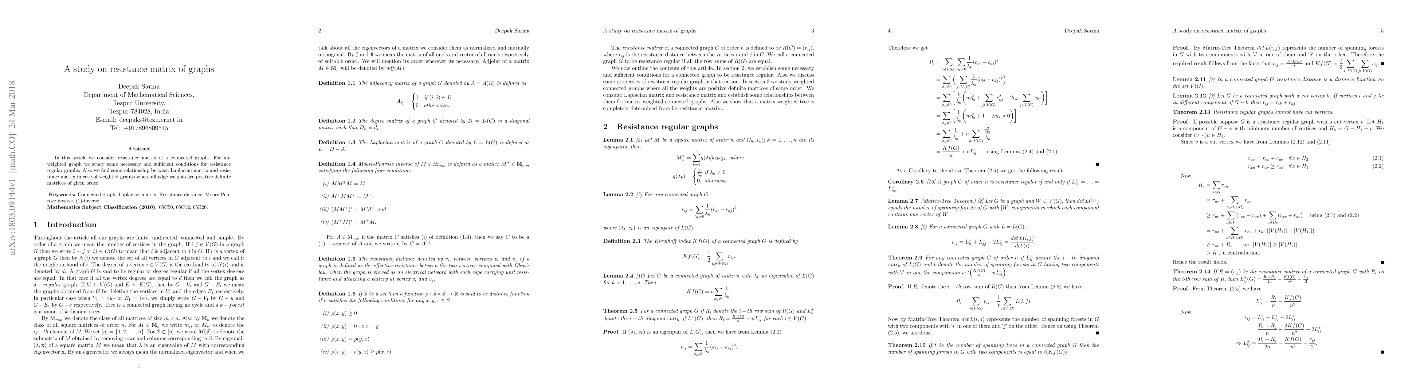 This research contributes to the understanding of graph theory by providing insights into the properties and applications of resistance matrices, which can be useful in network analysis, optimization, and robustness studies.
