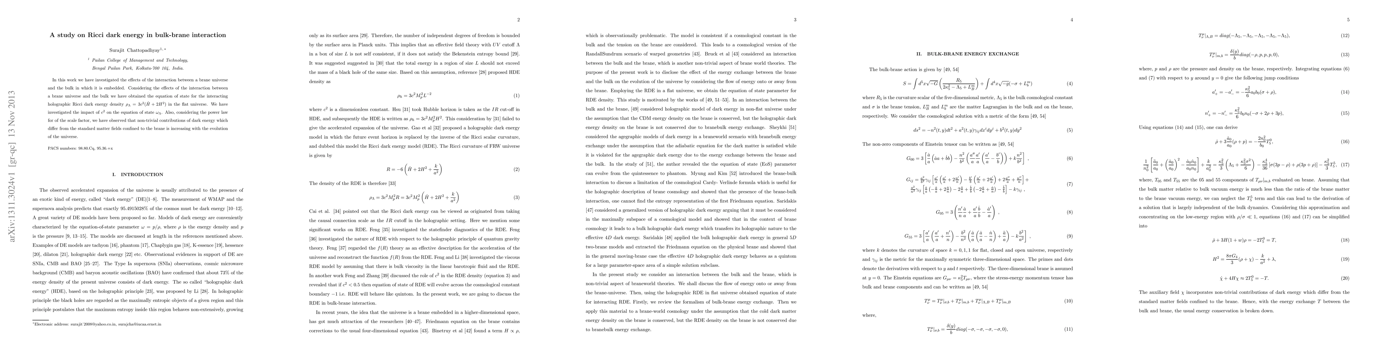This study investigates the interaction between a brane universe and its surrounding bulk, deriving the equation of state for holographic Ricci dark energy. The research finds that the parameter $c^2$ influences the equation of state $\omega_{\Lambda}$, and non-trivial dark energy contributions grow with the universe's evolution.