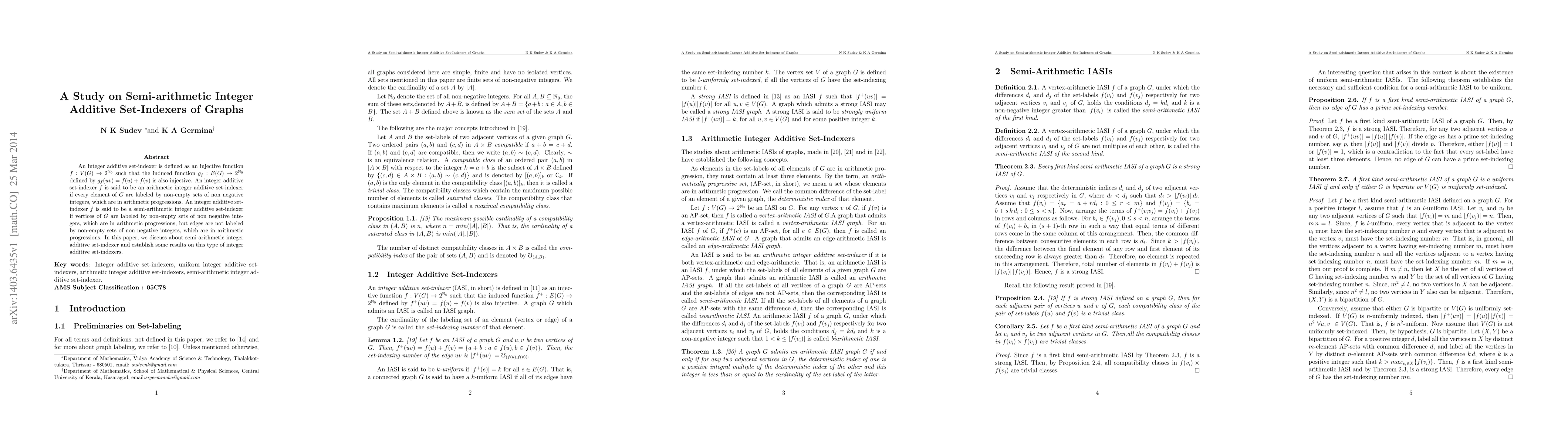An integer additive set-indexer is defined as an injective function $f:V(G)\rightarrow 2^{\mathbb{N}_0}$ such that the induced function $g_f:E(G) \rightarrow 2^{\mathbb{N}_0}$ defined by $g_f (uv) = f(u)+ f(v)$ is also injective. An integer additive set-indexer $f$ is said to be an arithmetic integer additive set-indexer if every element of $G$ are labeled by non-empty sets of non negative integers, which are in arithmetic progressions. An integer additive set-indexer $f$ is said to be a semi-arithmetic integer additive set-indexer if vertices of $G$ are labeled by non-empty sets of non negative integers, which are in arithmetic progressions, but edges are not labeled by non-empty sets of non negative integers, which are in arithmetic progressions. In this paper, we discuss about semi-arithmetic integer additive set-indexer and establish some results on this type of integer additive set-indexers.