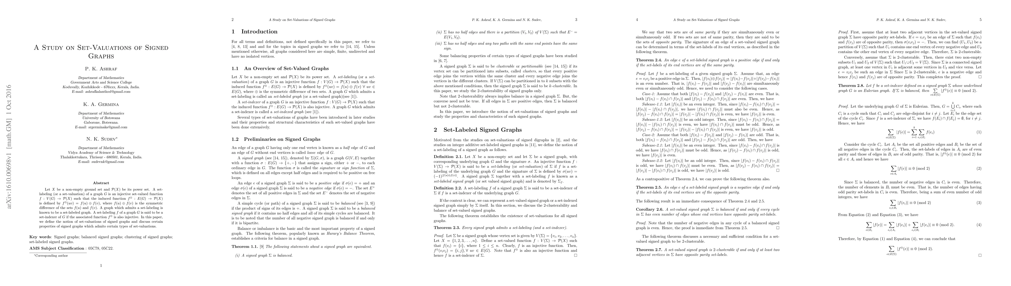 The paper defines set-valuations for signed graphs, introducing the concept of set-labeled signed graphs and studying their properties, particularly focusing on 2-clusterability and balance.