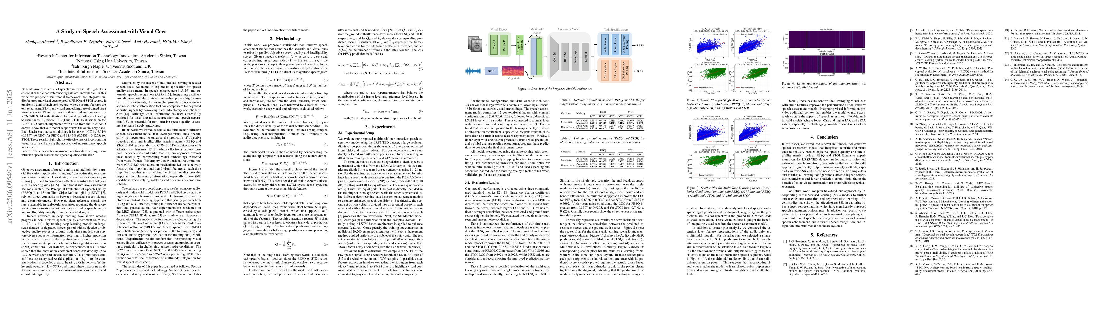 Non-intrusive assessment of speech quality and intelligibility is essential when clean reference signals are unavailable. In this work, we propose a multimodal framework that integrates audio features and visual cues to predict PESQ and STOI scores. It employs a dual-branch architecture, where spectral features are extracted using STFT, and visual embeddings are obtained via a visual encoder. These features are then fused and processed by a CNN-BLSTM with attention, followed by multi-task learning to simultaneously predict PESQ and STOI. Evaluations on the LRS3-TED dataset, augmented with noise from the DEMAND corpus, show that our model outperforms the audio-only baseline. Under seen noise conditions, it improves LCC by 9.61% (0.8397->0.9205) for PESQ and 11.47% (0.7403->0.8253) for STOI. These results highlight the effectiveness of incorporating visual cues in enhancing the accuracy of non-intrusive speech assessment.