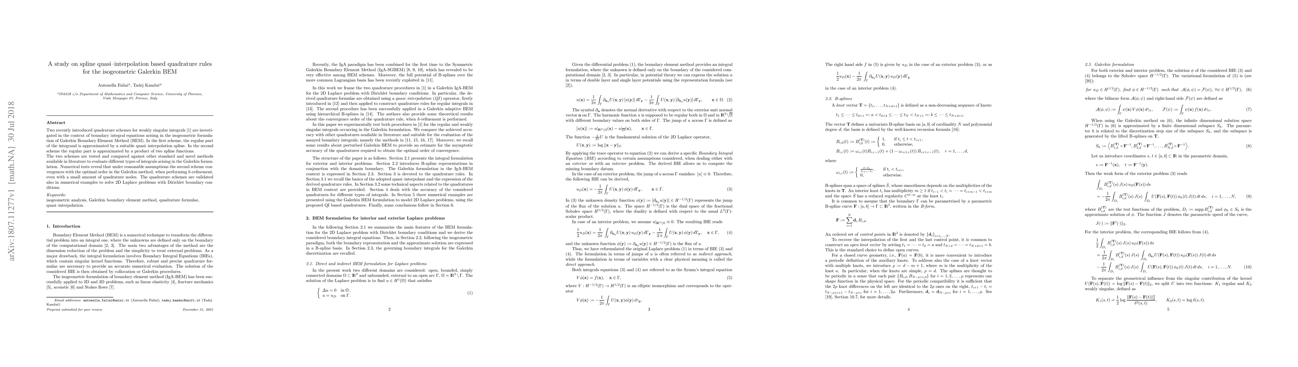 Two recently introduced quadrature schemes for weakly singular integrals [Calabr\`o et al. J. Comput. Appl. Math. 2018] are investigated in the context of boundary integral equations arising in the isogeometric formulation of Galerkin Boundary Element Method (BEM). In the first scheme, the regular part of the integrand is approximated by a suitable quasi--interpolation spline. In the second scheme the regular part is approximated by a product of two spline functions. The two schemes are tested and compared against other standard and novel methods available in literature to evaluate different types of integrals arising in the Galerkin formulation. Numerical tests reveal that under reasonable assumptions the second scheme convergences with the optimal order in the Galerkin method, when performing $h$-refinement, even with a small amount of quadrature nodes. The quadrature schemes are validated also in numerical examples to solve 2D Laplace problems with Dirichlet boundary conditions.