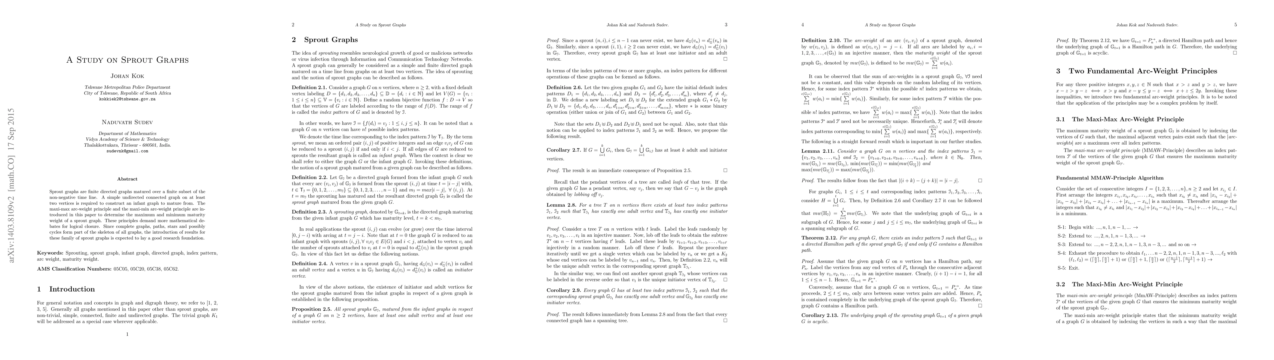 This paper studies sprout graphs, introducing principles to determine their maximum and minimum maturity weights based on a connected undirected graph. It explores the properties of sprout graphs in a finite directed graph over a non-negative time line.
