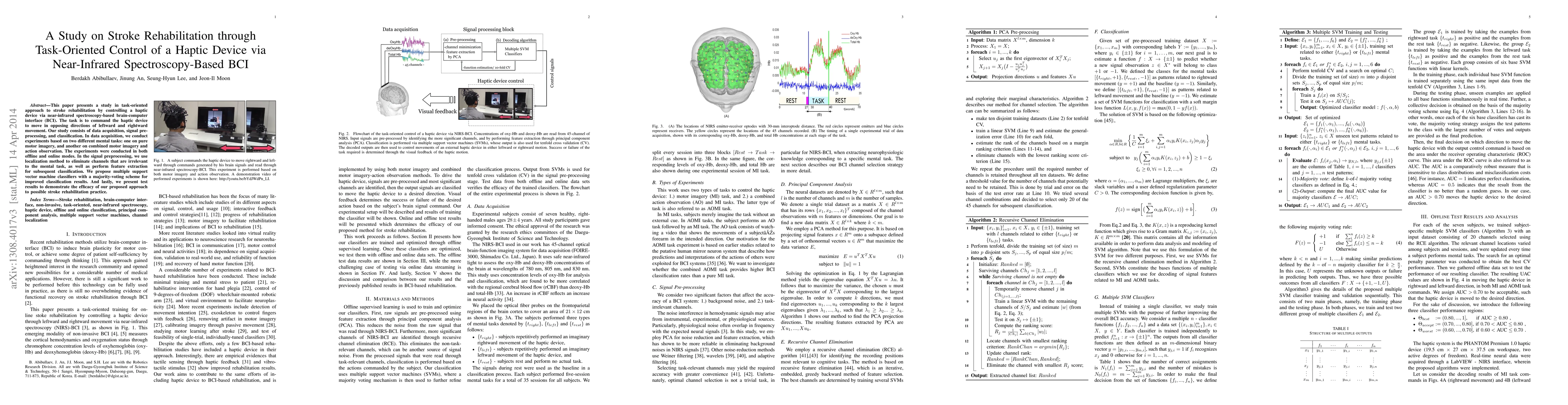 This study explores a task-oriented stroke rehabilitation method using a haptic device controlled via a near-infrared spectroscopy-based brain-computer interface, employing pure motor imagery and combined imagery with action observation. The proposed approach includes signal preprocessing and multiple classifier systems, demonstrating potential for effective rehabilitation.