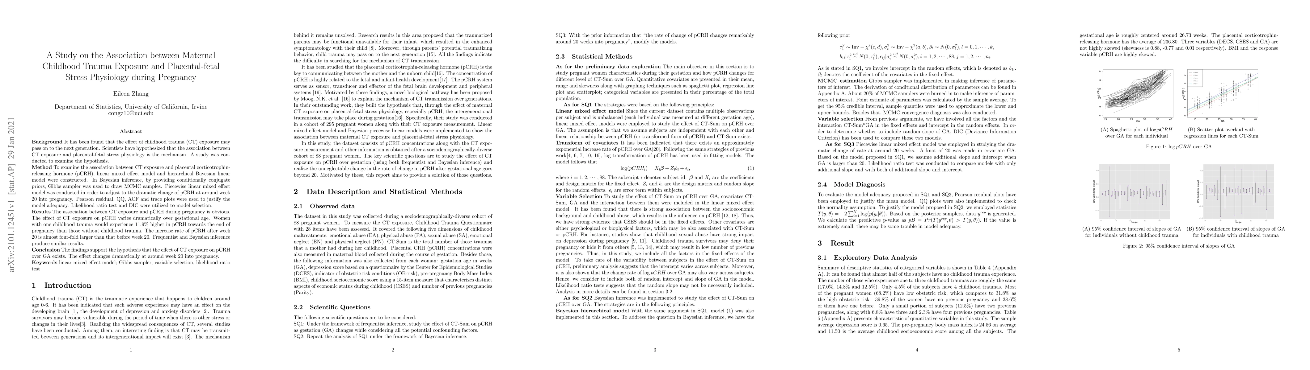 It has been found that the effect of childhood trauma (CT) exposure may pass on to the next generation. Scientists have hypothesized that the association between CT exposure and placental-fetal stress physiology is the mechanism. A study was conducted to examine the hypothesis. To examine the association between CT exposure and placental corticotrophin-releasing hormone (pCRH), linear mixed effect model and hierarchical Bayesian linear model were constructed. In Bayesian inference, by providing conditionally conjugate priors, Gibbs sampler was used to draw MCMC samples. Piecewise linear mixed effect model was conducted in order to adjust to the dramatic change of pCRH at around week 20 into pregnancy. Pearson residual, QQ, ACF and trace plots were used to justify the model adequacy. Likelihood ratio test and DIC were utilized to model selection. The association between CT exposure and pCRH during pregnancy is obvious. The effect of CT exposure on pCRH varies dramatically over gestational age. Women with one childhood trauma would experience 11.9% higher in pCRH towards the end of pregnancy than those without childhood trauma. The increase rate of pCRH after week 20 is almost four-fold larger than that before week 20. Frequentist and Bayesian inference produce similar results. The findings support the hypothesis that the effect of CT exposure on pCRH over GA exists. The effect changes dramatically at around week 20 into pregnancy.