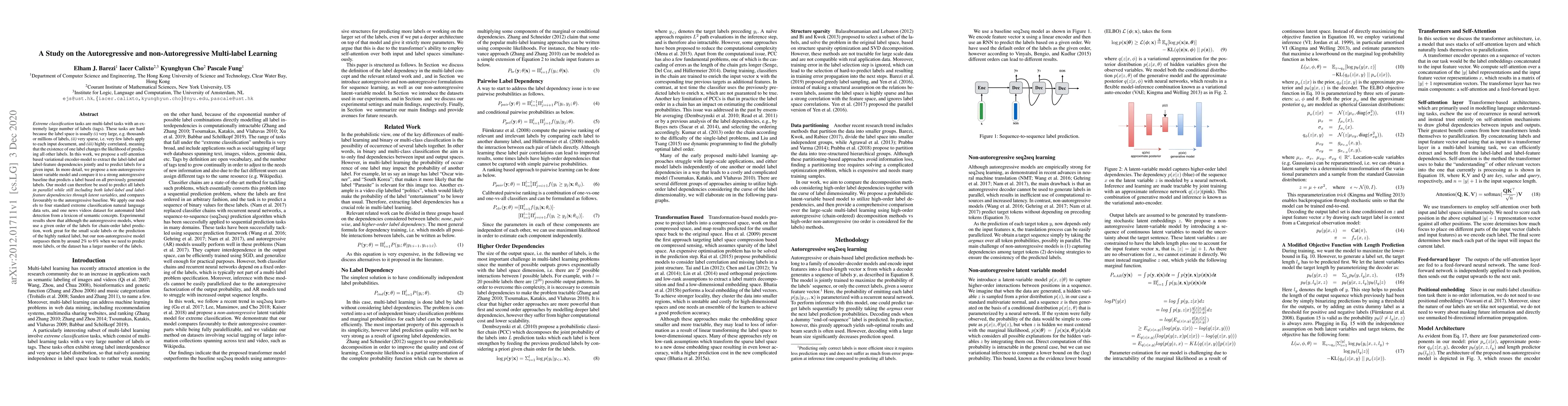 Extreme classification tasks are multi-label tasks with an extremely large number of labels (tags). These tasks are hard because the label space is usually (i) very large, e.g. thousands or millions of labels, (ii) very sparse, i.e. very few labels apply to each input document, and (iii) highly correlated, meaning that the existence of one label changes the likelihood of predicting all other labels. In this work, we propose a self-attention based variational encoder-model to extract the label-label and label-feature dependencies jointly and to predict labels for a given input. In more detail, we propose a non-autoregressive latent variable model and compare it to a strong autoregressive baseline that predicts a label based on all previously generated labels. Our model can therefore be used to predict all labels in parallel while still including both label-label and label-feature dependencies through latent variables, and compares favourably to the autoregressive baseline. We apply our models to four standard extreme classification natural language data sets, and one news videos dataset for automated label detection from a lexicon of semantic concepts. Experimental results show that although the autoregressive models, where use a given order of the labels for chain-order label prediction, work great for the small scale labels or the prediction of the highly ranked label, but our non-autoregressive model surpasses them by around 2% to 6% when we need to predict more labels, or the dataset has a larger number of the labels.