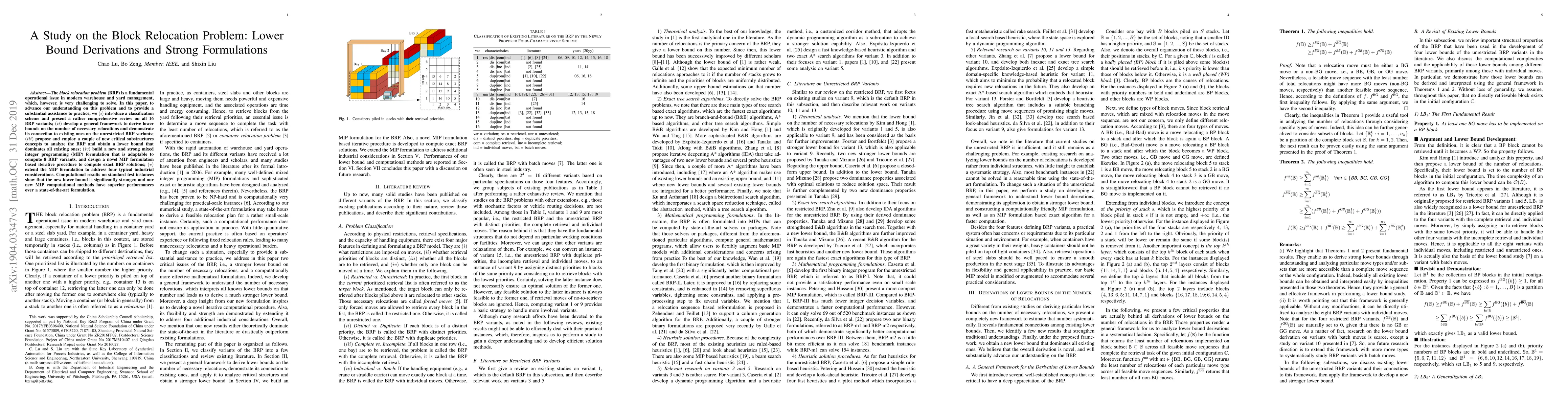 The block relocation problem (BRP) is a fundamental operational issue in modern warehouse and yard management, which, however, is very challenging to solve. In this paper, to advance our understanding on this problem and to provide a substantial assistance to practice, we (i) introduce a classification scheme and present a rather comprehensive review on all 16 BRP variants; (ii) develop a general framework to derive lower bounds on the number of necessary relocations and demonstrate its connection to existing lower bounds of the unrestricted BRP variants; (iii) propose and employ a couple of new critical substructures concepts to analyze the BRP and obtain a lower bound that dominates all existing ones; (iv) build a new and strong mixed integer programming (MIP) formulation that is adaptable to compute 8 BRP variants, and design a novel MIP-formulation-based iterative procedure to compute exact BRP solutions; (v) extend the MIP formulation to address four typical industrial considerations. Computational results on standard test instances show that the new lower bound is significantly stronger, and our new MIP computational methods have superior performances over a state-of-the-art formulation.