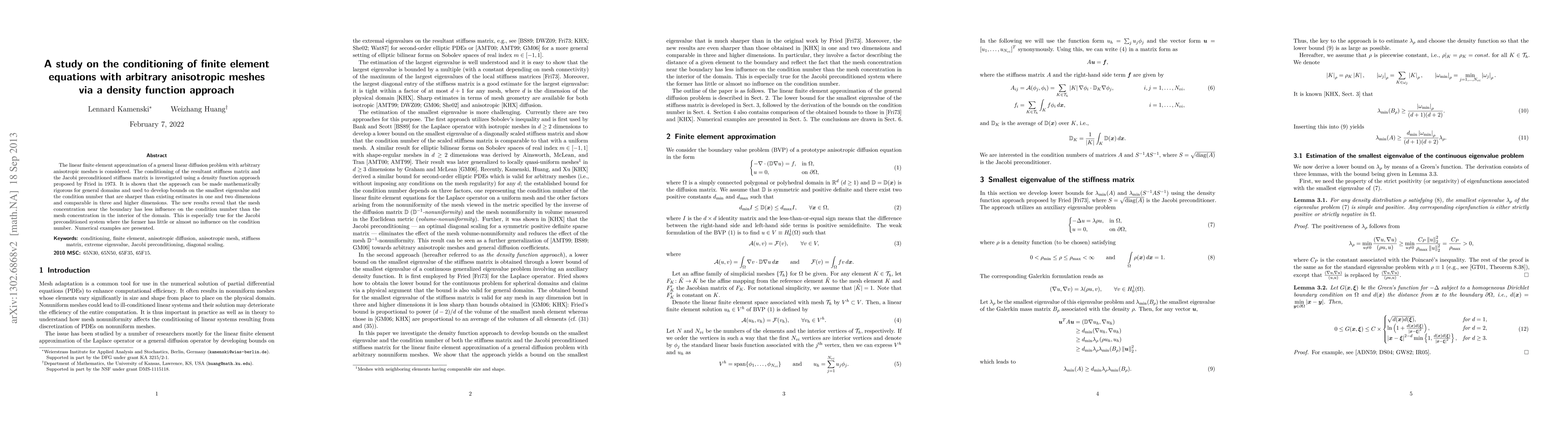 The linear finite element approximation of a general linear diffusion problem with arbitrary anisotropic meshes is considered. The conditioning of the resultant stiffness matrix and the Jacobi preconditioned stiffness matrix is investigated using a density function approach proposed by Fried in 1973. It is shown that the approach can be made mathematically rigorous for general domains and used to develop bounds on the smallest eigenvalue and the condition number that are sharper than existing estimates in one and two dimensions and comparable in three and higher dimensions. The new results reveal that the mesh concentration near the boundary has less influence on the condition number than the mesh concentration in the interior of the domain. This is especially true for the Jacobi preconditioned system where the former has little or almost no influence on the condition number. Numerical examples are presented.