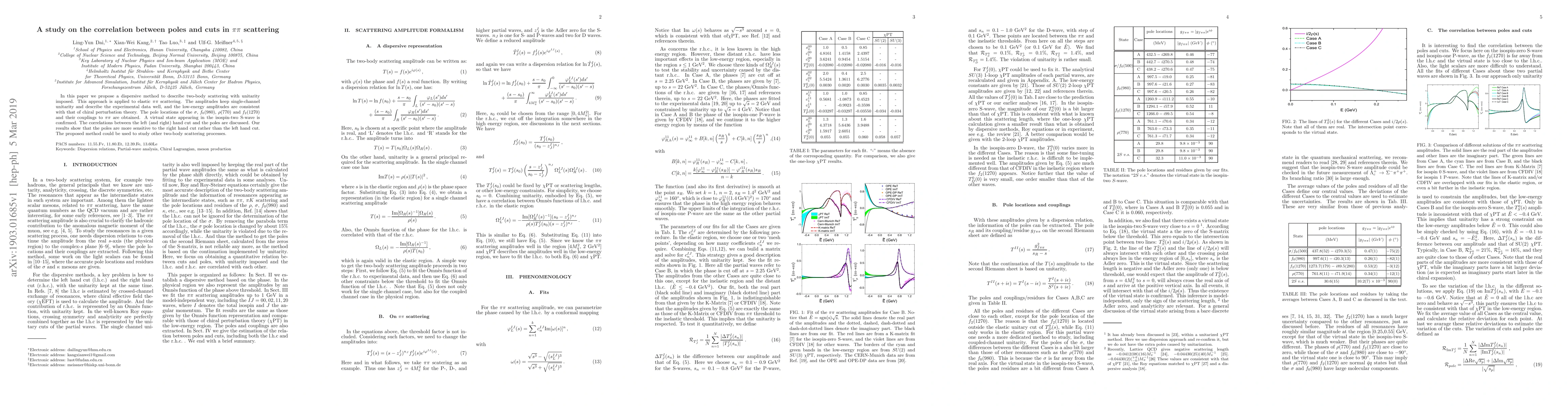 This paper introduces a dispersive method for describing $\pi\pi$ scattering that maintains unitarity and aligns well with experimental data and chiral perturbation theory. It identifies poles corresponding to $\sigma$, $f_0(980)$, $\rho(770)$, and $f_2(1270)$ mesons and confirms a virtual state in isospin-two S-wave, revealing that poles are more sensitive to the right-hand cut.