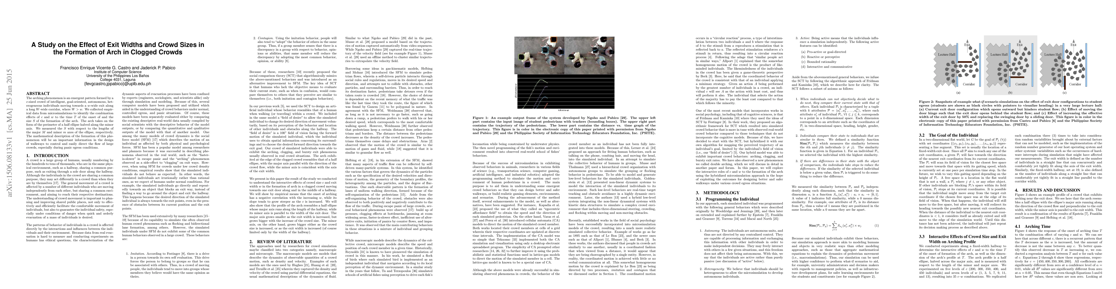 The arching phenomenon is an emergent pattern formed by a $c$-sized crowd of intelligent, goal-oriented, autonomous, heterogeneous individuals moving towards a $w$-wide exit along a long $W$-wide corridor, where $W>w$. We collected empirical data from microsimulations to identify the combination effects of~$c$ and~$w$ to the time~$T$ of the onset of and the size~$S$ of the formation of the arch. The arch takes on the form of the perimeter of a half ellipse halved along the minor axis. We measured the~$S$ with respect to the lengths of the major~$M$ and minor~$m$ axes of the ellipse, respectively. The mathematical description of the formation of this phenomenon will be an important information in the design of walkways to control and easily direct the flow of large crowds, especially during panic egress conditions.