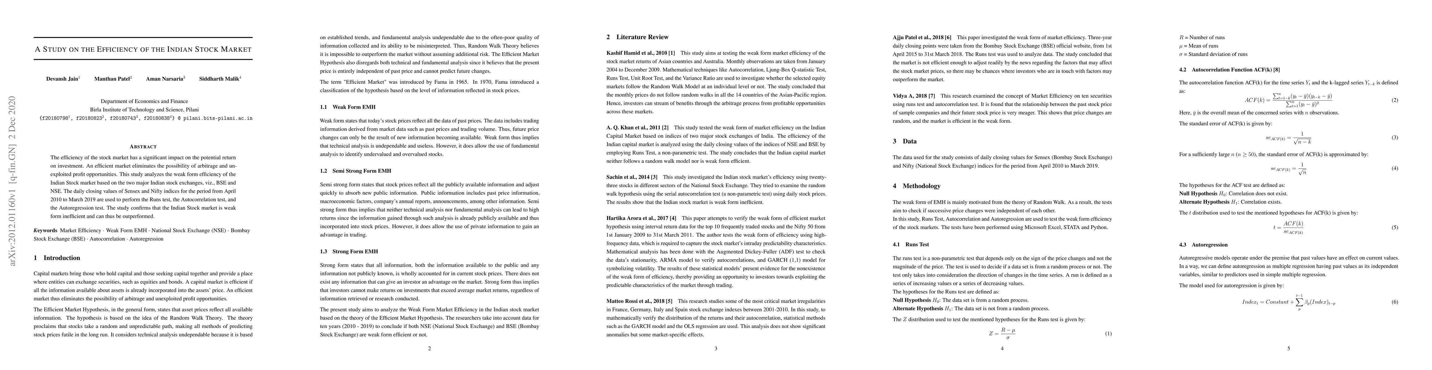 The study employed various statistical techniques including Runs Test, Autocorrelation Test, and Autoregression Test to analyze the weak form efficiency of the Indian Stock market.