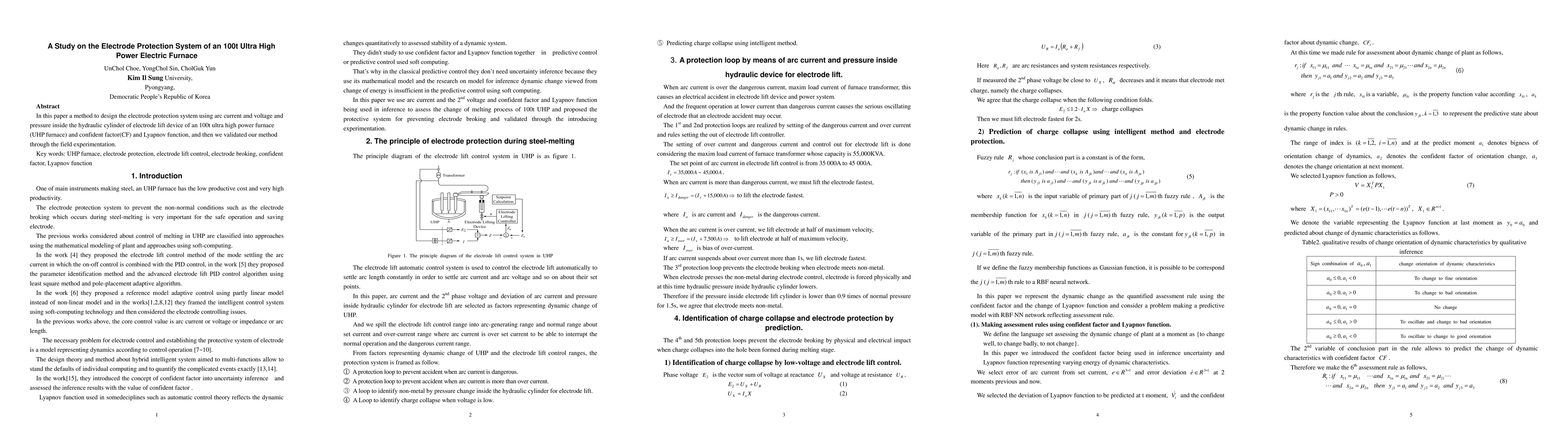 In this paper a method to design the electrode protection system using arc current and voltage and pressure inside the hydraulic cylinder of electrode lift device of an 100t ultra high power furnace (UHP furnace) and confident factor(CF) and Lyapnov function, and then we validated our method through the field experimentation.