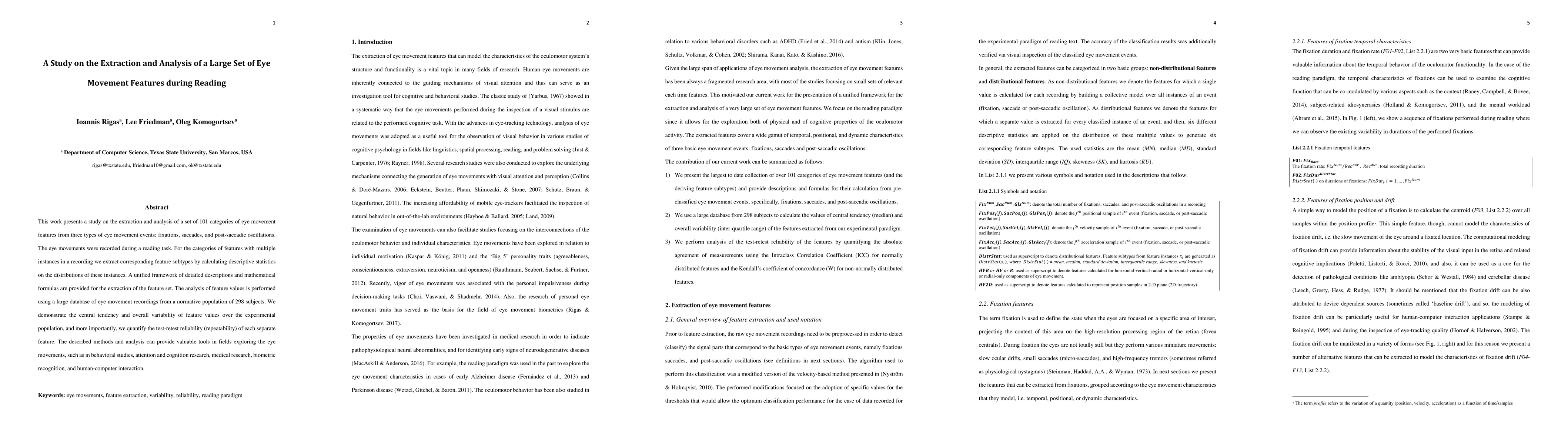 This study extracts and analyzes 101 eye movement features from fixations, saccades, and oscillations during reading, providing a unified framework for feature extraction. The analysis reveals central tendencies, variability, and test-retest reliability across a database of 298 subjects, offering tools for behavioral, cognitive, medical, biometric, and human-computer interaction research.