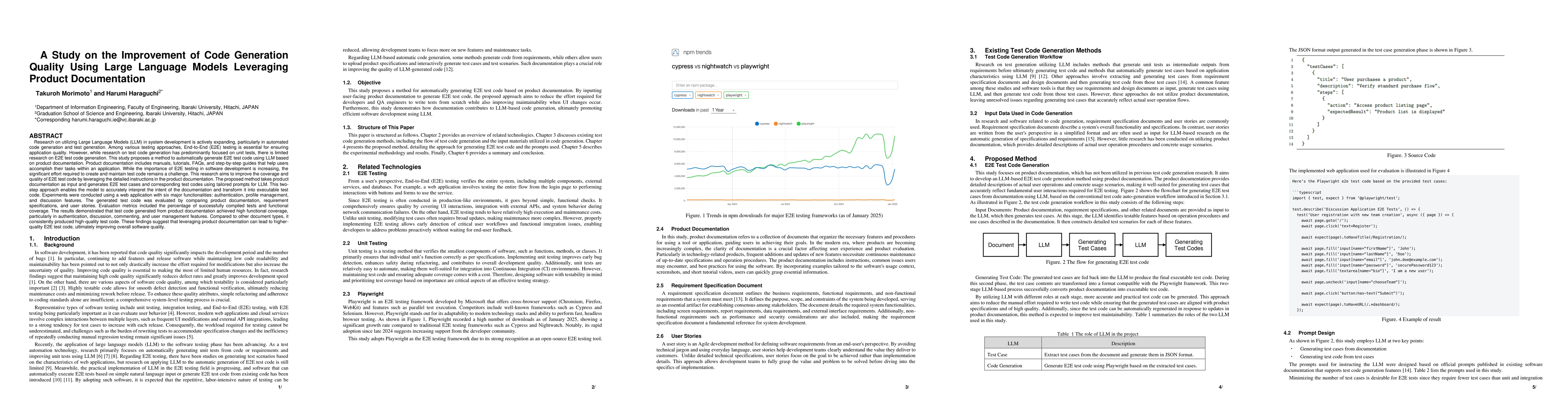 This study proposes a method using Large Language Models to generate E2E test code from product documentation, achieving high compilation success and functional coverage. Experiments on a web app demonstrated that tests derived from documentation outperformed those based on traditional specs, highlighting the potential of documentation in enhancing software quality.