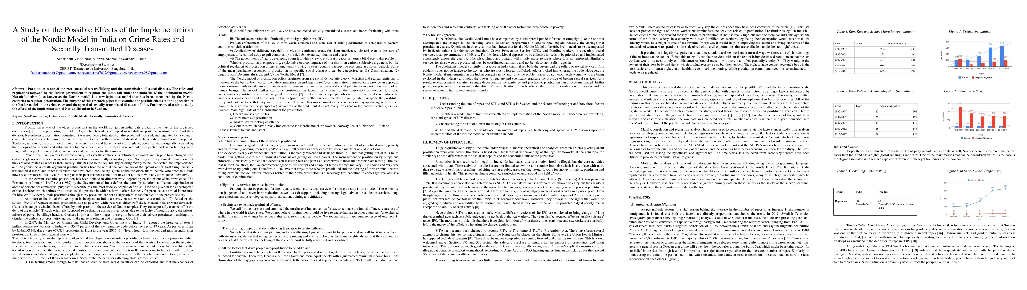This paper investigates the potential impacts of adopting the Nordic model of prostitution regulation in India on crime rates and sexually transmitted disease transmission. It also evaluates the outcomes of the Nordic model's implementation in Sweden.