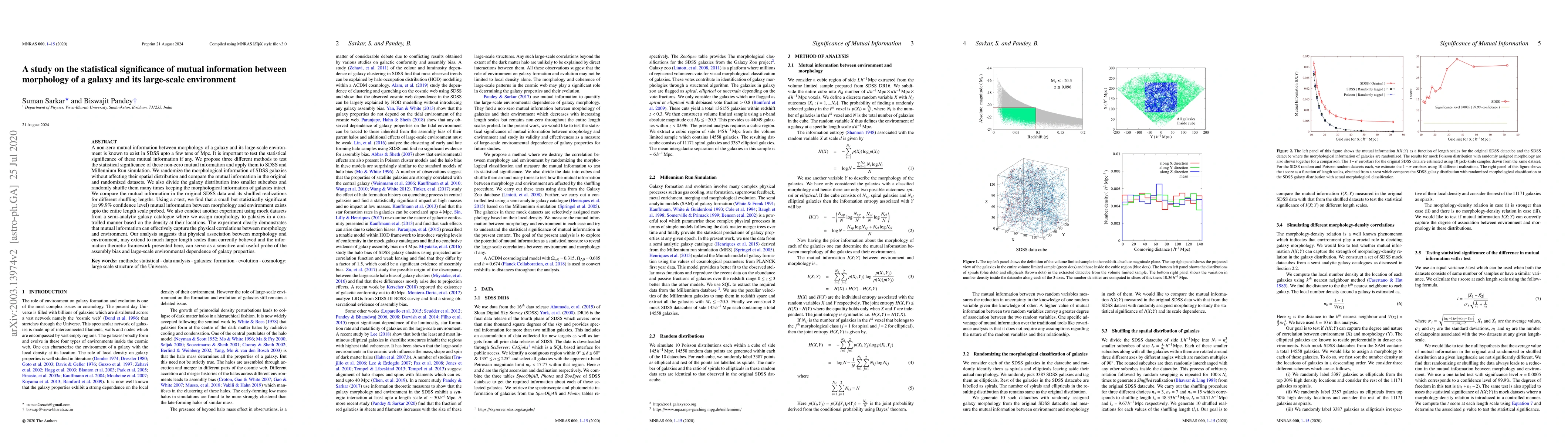 A non-zero mutual information between morphology of a galaxy and its large-scale environment is known to exist in SDSS upto a few tens of Mpc. It is important to test the statistical significance of these mutual information if any. We propose three different methods to test the statistical significance of these non-zero mutual information and apply them to SDSS and Millennium Run simulation. We randomize the morphological information of SDSS galaxies without affecting their spatial distribution and compare the mutual information in the original and randomized datasets. We also divide the galaxy distribution into smaller subcubes and randomly shuffle them many times keeping the morphological information of galaxies intact. We compare the mutual information in the original SDSS data and its shuffled realizations for different shuffling lengths. Using a t-test, we find that a small but statistically significant (at 99.9% confidence level) mutual information between morphology and environment exists upto the entire length scale probed. We also conduct another experiment using mock datasets from a semi-analytic galaxy catalogue where we assign morphology to galaxies in a controlled manner based on the density at their locations. The experiment clearly demonstrate that mutual information can effectively capture the physical correlations between morphology and environment. Our analysis suggests that physical association between morphology and environment may extend to much larger length scales than currently believed and the information theoretic framework presented here, can serve as a sensitive and useful probe of the assembly bias and large-scale environmental dependence of galaxy properties.