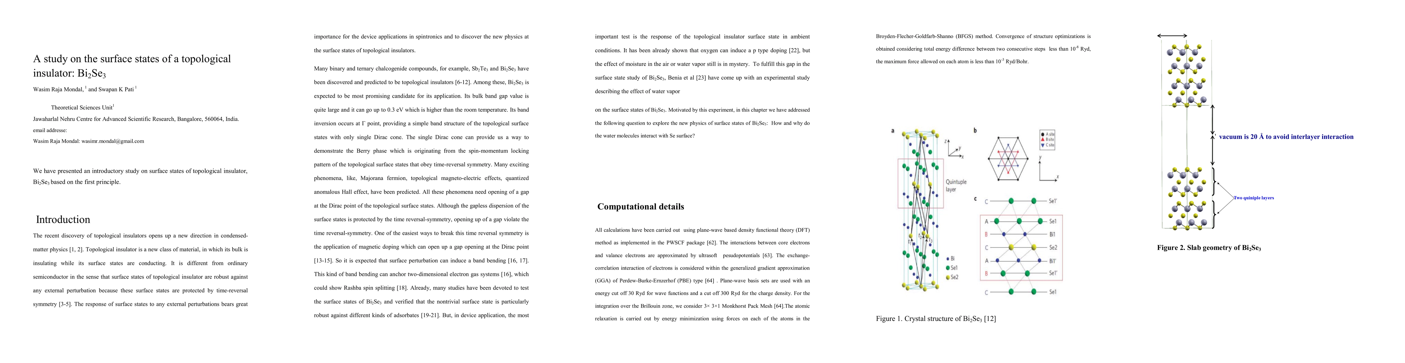 Summary: This study investigates the surface states of the topological insulator Bi2Se3 using first-principle calculations, providing foundational insights into its electronic properties. The research highlights the unique characteristics of Bi2Se3's surface states, crucial for potential applications in quantum computing and spintronics.