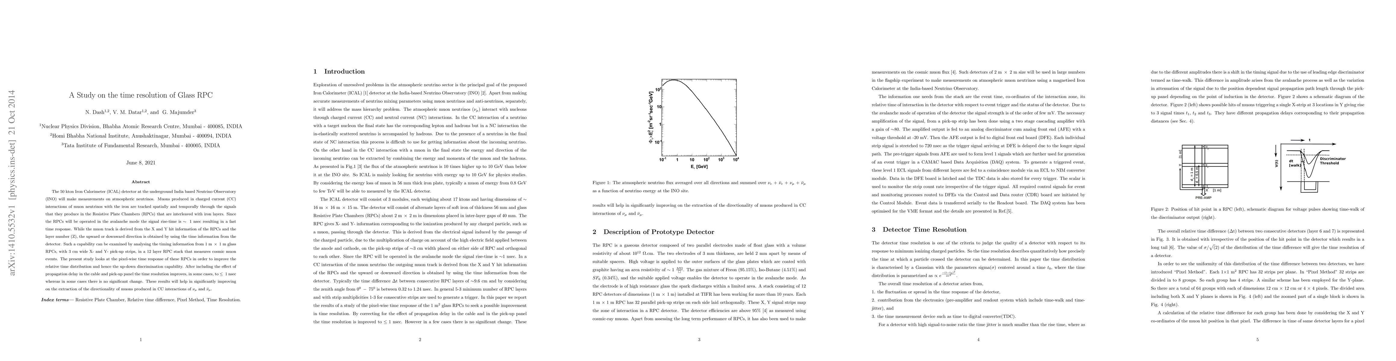 The 50~kton Iron Calorimeter (ICAL) detector at the underground India based Neutrino Observatory (INO) will make measurements on atmospheric neutrinos. Muons produced in charged current (CC) interactions of muon neutrinos with the iron are tracked spatially and temporally through the signals that they produce in the Resistive Plate Chambers~(RPCs) that are interleaved with iron layers. Since the RPCs will be operated in the avalanche mode the signal rise-time is $\sim~1~\rm{nsec}$ resulting in a fast time response. While the muon track is derived from the X and Y hit information of the RPCs and the layer number (Z), the upward or downward direction is obtained by using the time information from the detector. Such a capability can be examined by analysing the timing information from $1~\rm{m}~\times~1~\rm{m}$ glass RPCs, with $3~\rm{cm}$ wide X- and Y- pick-up strips, in a $12$ layer RPC stack that measures cosmic muon events. The present study looks at the pixel-wise time response of these RPCs in order to improve the relative time distribution and hence the up-down discrimination capability. After including the effect of propagation delay in the cable and pick-up panel the time resolution improves, in some cases, to $\leq~1~\rm{nsec}$ whereas in some cases there is no significant change. These results will help in significantly improving on the extraction of the directionality of muons produced in CC interactions of $\nu_{\mu}$ and $\bar{\nu}_{\mu}$.