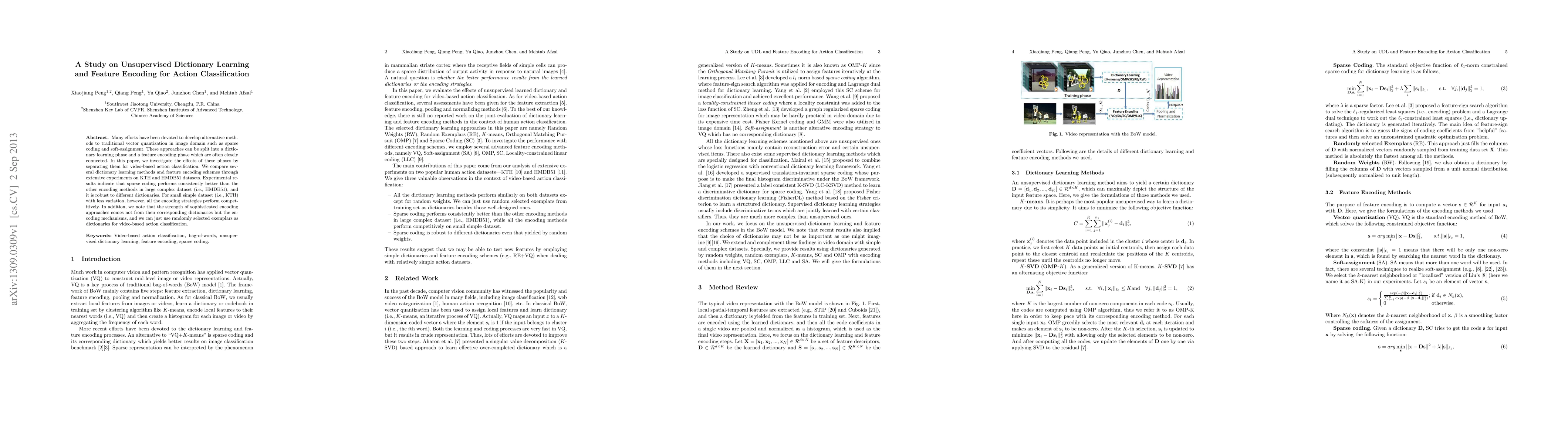 A study compares dictionary learning methods and feature encoding schemes for video-based action classification, finding that sparse coding outperforms others in large datasets, while simpler approaches perform competitively in smaller datasets.