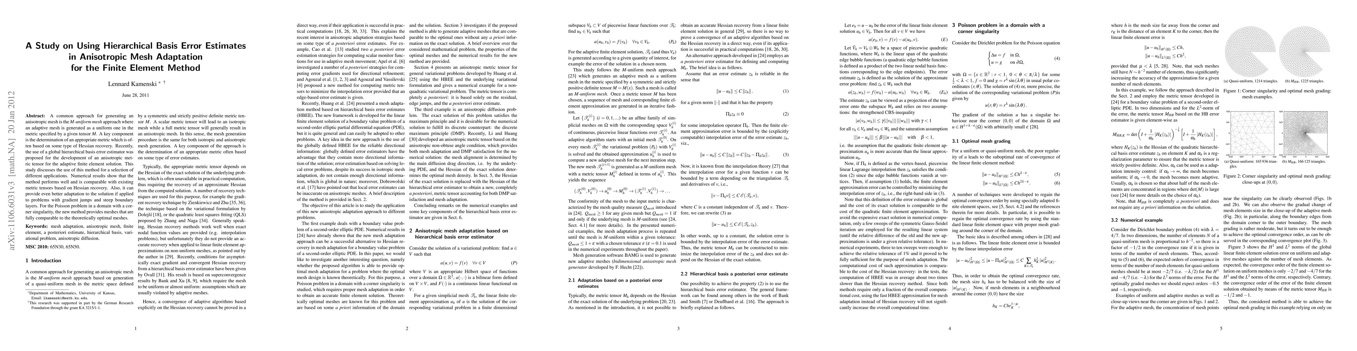 This study explores the use of a global hierarchical basis error estimator for developing anisotropic mesh adaptation in the finite element method, demonstrating its effectiveness and superior performance in handling gradient jumps and boundary layers, especially for problems with singularities. Numerical results indicate comparable or better adaptation compared to traditional Hessian-based methods.