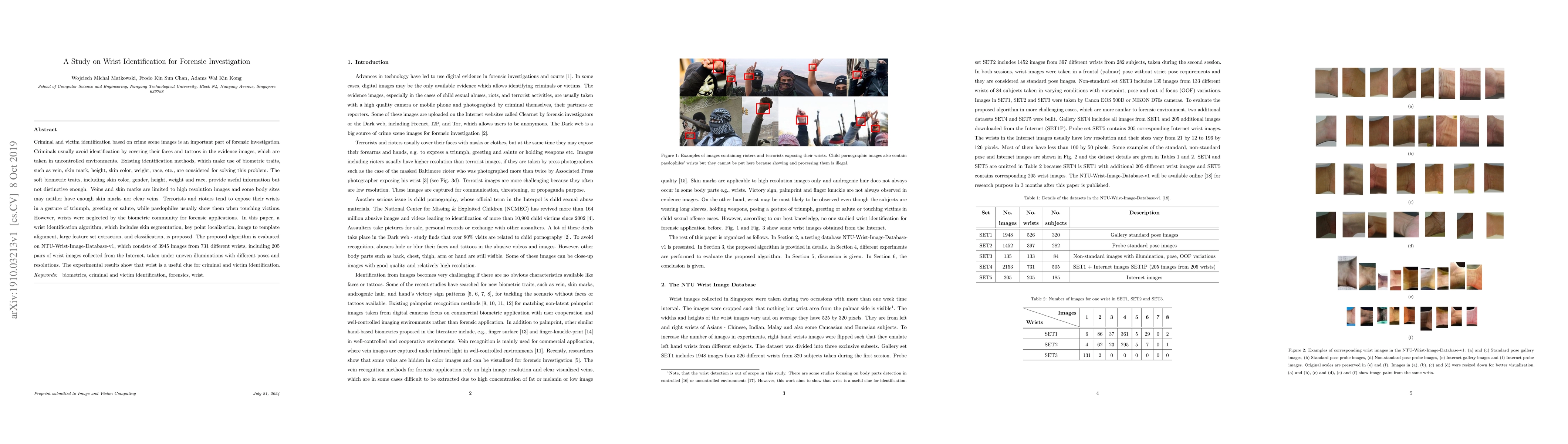 Criminal and victim identification based on crime scene images is an important part of forensic investigation. Criminals usually avoid identification by covering their faces and tattoos in the evidence images, which are taken in uncontrolled environments. Existing identification methods, which make use of biometric traits, such as vein, skin mark, height, skin color, weight, race, etc., are considered for solving this problem. The soft biometric traits, including skin color, gender, height, weight and race, provide useful information but not distinctive enough. Veins and skin marks are limited to high resolution images and some body sites may neither have enough skin marks nor clear veins. Terrorists and rioters tend to expose their wrists in a gesture of triumph, greeting or salute, while paedophiles usually show them when touching victims. However, wrists were neglected by the biometric community for forensic applications. In this paper, a wrist identification algorithm, which includes skin segmentation, key point localization, image to template alignment, large feature set extraction, and classification, is proposed. The proposed algorithm is evaluated on NTU-Wrist-Image-Database-v1, which consists of 3945 images from 731 different wrists, including 205 pairs of wrist images collected from the Internet, taken under uneven illuminations with different poses and resolutions. The experimental results show that wrist is a useful clue for criminal and victim identification. Keywords: biometrics, criminal and victim identification, forensics, wrist.