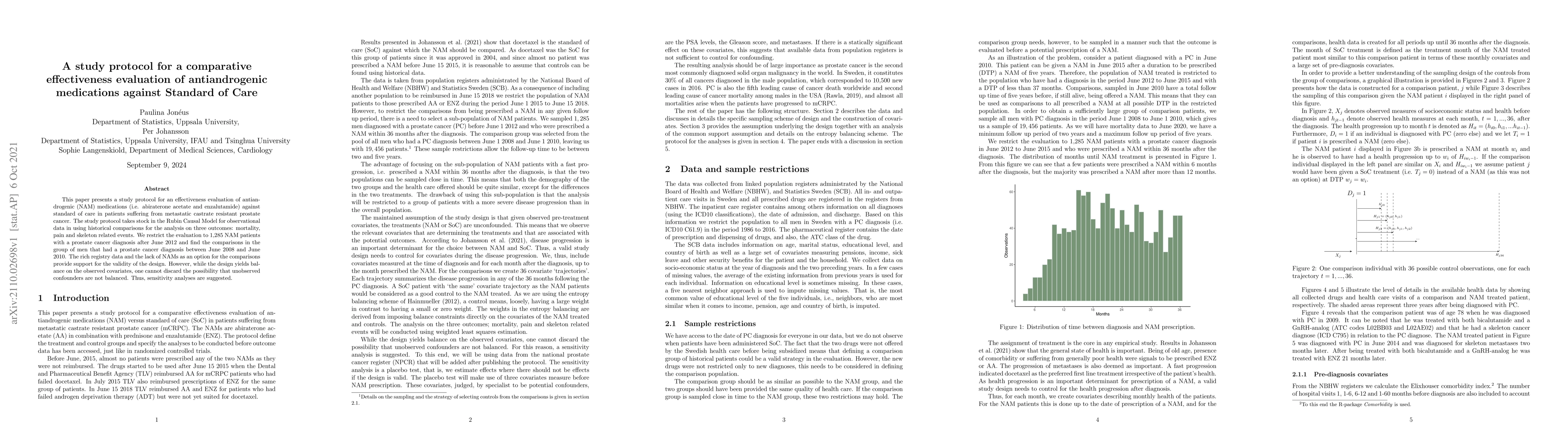 This paper presents a study protocol for an effectiveness evaluation of antiandrogenic (NAM) medications (i.e. abiraterone acetate and enzalutamide) against standard of care in patients suffering from metastatic castrate resistant prostate cancer. The study protocol takes stock in the Rubin Causal Model for observational data in using historical comparisons for the analysis on three outcomes: mortality, pain and skeleton related events. We restrict the evaluation to 1,285 NAM patients with a prostate cancer diagnosis after June 2012 and find the comparisons in the group of men that had a prostate cancer diagnosis between June 2008 and June 2010. The rich registry data and the lack of NAMs as an option for the comparisons provide support for the validity of the design. However, while the design yields balance on the observed covariates, one cannot discard the possibility that unobserved confounders are not balanced. Thus, sensitivity analyses are suggested.