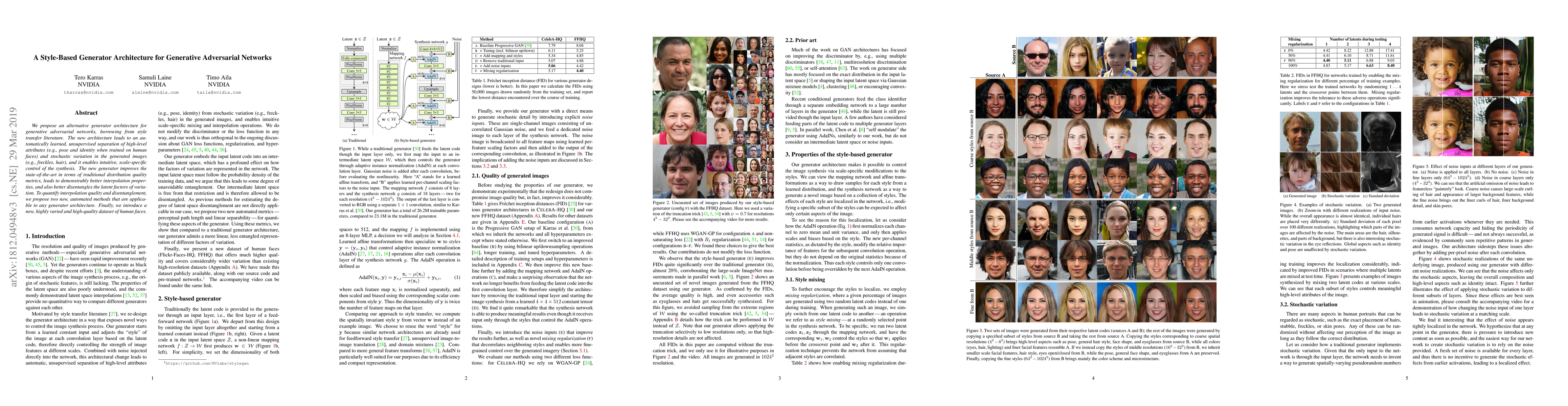 We propose an alternative generator architecture for generative adversarial networks, borrowing from style transfer literature. The new architecture leads to an automatically learned, unsupervised separation of high-level attributes (e.g., pose and identity when trained on human faces) and stochastic variation in the generated images (e.g., freckles, hair), and it enables intuitive, scale-specific control of the synthesis. The new generator improves the state-of-the-art in terms of traditional distribution quality metrics, leads to demonstrably better interpolation properties, and also better disentangles the latent factors of variation. To quantify interpolation quality and disentanglement, we propose two new, automated methods that are applicable to any generator architecture. Finally, we introduce a new, highly varied and high-quality dataset of human faces.
