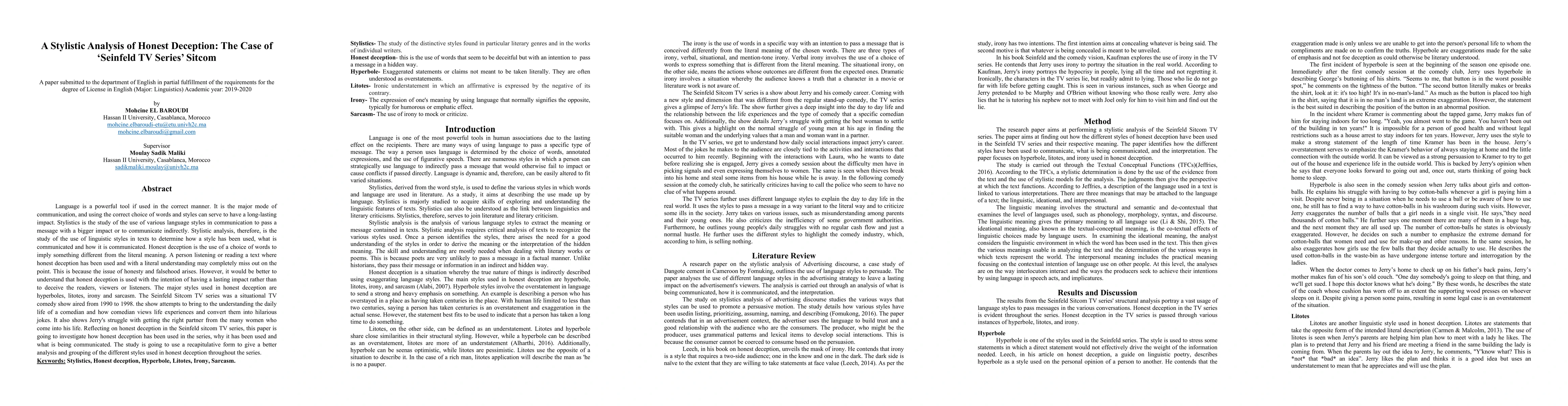 This paper conducts a stylistic analysis of the Seinfeld sitcom to explore how honest deception—using language to imply meanings beyond the literal—is employed to enhance humor and impact. It examines specific styles like hyperbole, irony, and sarcasm to understand their communicative functions within the show's context.