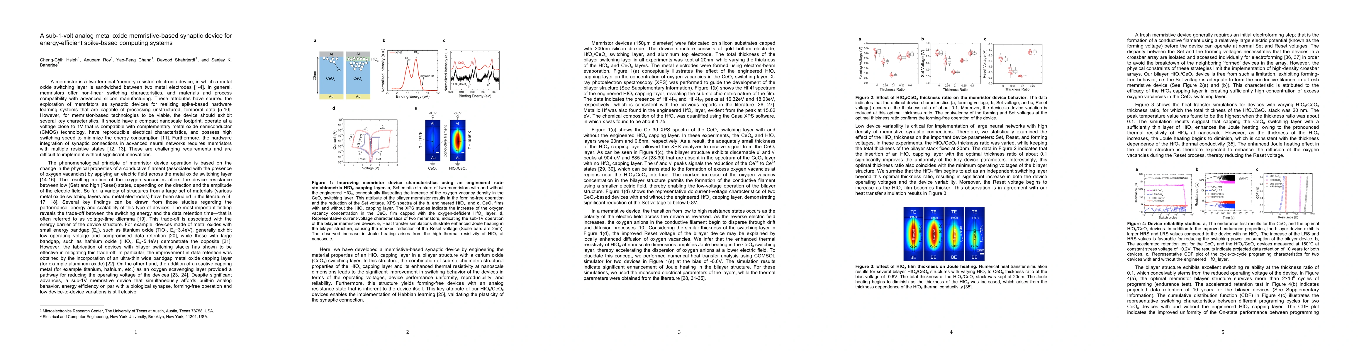 This paper presents a novel sub-1-volt, energy-efficient metal oxide memristor for synaptic devices in brain-inspired computing, achieving low-power operation and demonstrating spike-timing-dependent plasticity, a key feature for Hebbian learning. The memristor's analog nature allows for direct programming to intermediate resistance states, supporting high-density neural networks.