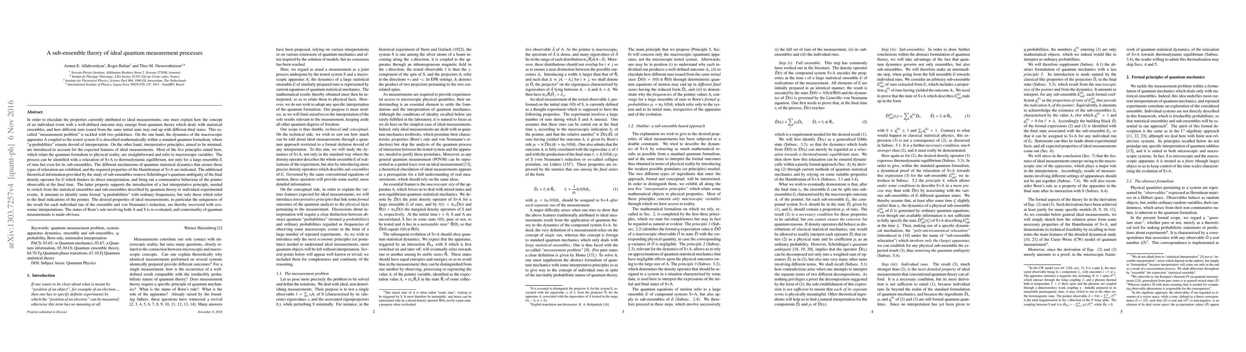 To elucidate ideal measurements, one must explain how individual events emerge from quantum theory which deals with statistical ensembles, and how different may end up with different final states. This so-called "measurement problem" is tackled with two guidelines. On the one hand, the dynamics of the macroscopic apparatus A coupled to the tested system S is described mathematically within a standard quantum formalism, where "q-probablities" remain devoid of interpretation. On the other hand, interpretative principles are introduced to account for the expected features of ideal measurements. Most of the five principles, which relate the quantum formalism to physical reality, are straightforward and refer to macroscopic variables. The process can be identified with a relaxation of S+A to thermodynamic equilibrium, not only for a large ensemble $\scriptE$ of runs but even for its sub-ensembles. The different mechanisms of quantum statistical dynamics that ensure the relaxation are exhibited. The additional information provided by the sub-ensembles remove Schr\"odinger's quantum ambiguity of the final density operator for $\scriptE$ which hinders its direct interpretation, and bring out a commutative behaviour of the pointer observable at the final time. The latter property supports the introduction of a last principle, needed to switch from the statistical ensembles and sub-ensembles described by quantum theory to individual experimental events. It amounts to identify some formal "q-probabilities" with ordinary frequencies, but only those which refer to the final pointer indications. The desired properties of ideal measurements, in particular the uniqueness of the result for each individual run and von Neumann's reduction, are thereby recovered with economic interpretations. The status of Born's rule involving both A and S is re-evaluated, and contextuality is made obvious.