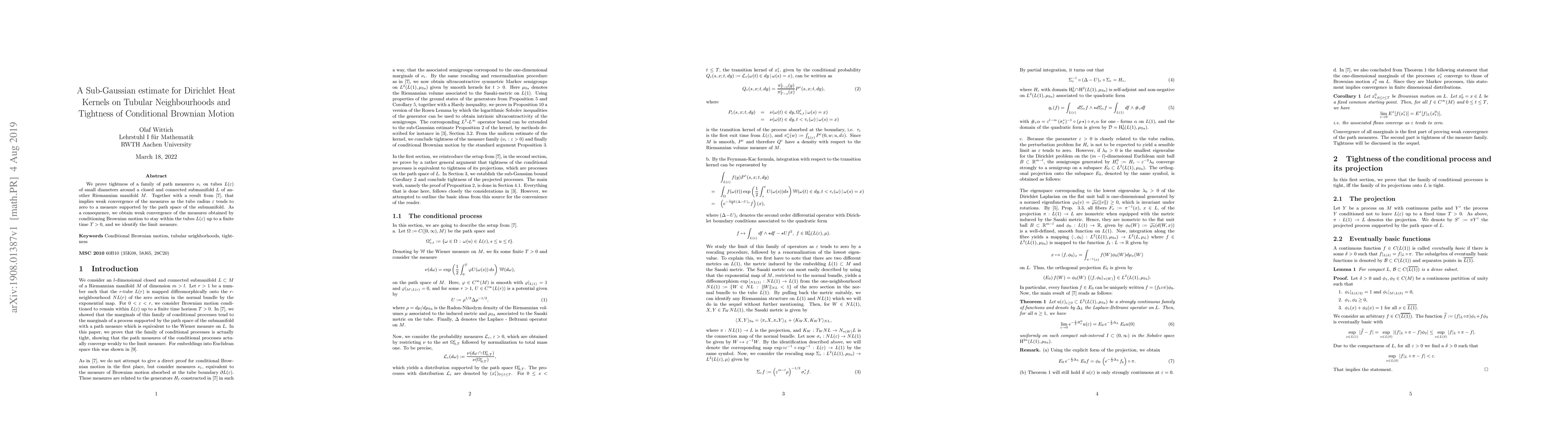 We prove tightness of a family of path measures $\nu_{\varepsilon}$ on tubes $L(\varepsilon)$ of small diameters around a closed and connected submanifold $L$ of another Riemannian manifold $M$. Together with a convergence result for Dirichlet semigroups on tubular neighbourhoods, that implies weak convergence of the measures as the tube radius $\varepsilon$ tends to zero to a measure supported by the path space of the submanifold. As a consequence, we obtain weak convergence of the measures obtained by conditioning Brownian motion to stay within the tubes $L(\varepsilon)$ up to a finite time $T>0$, and we identify the limit measure.