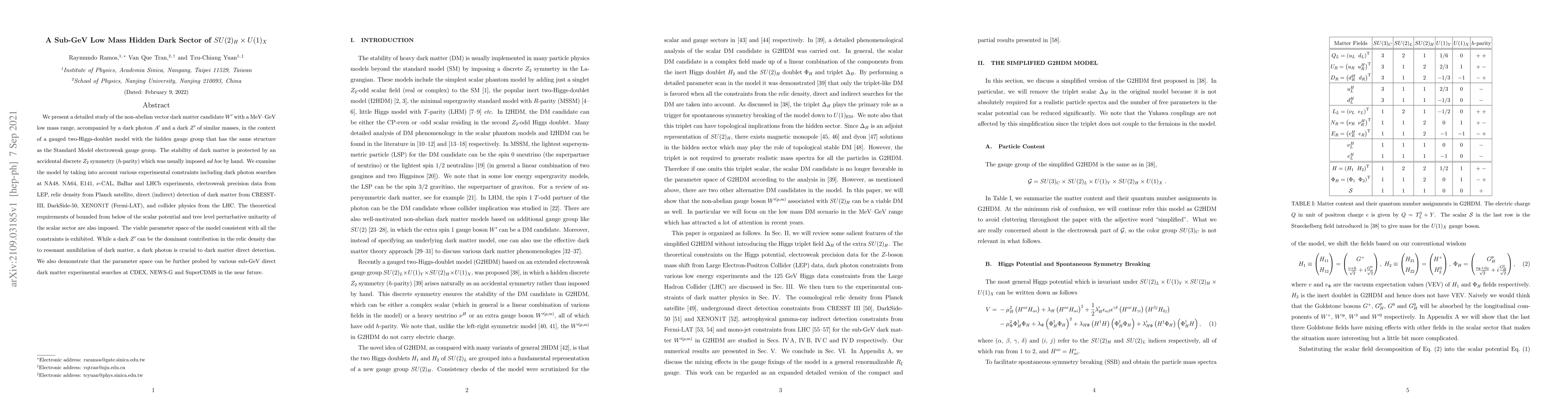 We present a detailed study of the non-abelian vector dark matter candidate $W^\prime$ with a MeV-GeV low mass range, accompanied by a dark photon $A^\prime$ and a dark $Z^\prime$ of similar masses, in the context of a gauged two-Higgs-doublet model with the hidden gauge group that has the same structure as the Standard Model electroweak gauge group. The stability of dark matter is protected by an accidental discrete $Z_2$ symmetry ($h$-parity) which was usually imposed ad hoc by hand. We examine the model by taking into account various experimental constraints including dark photon searches at NA48, NA64, E141, $\nu$-CAL, BaBar and LHCb experiments, electroweak precision data from LEP, relic density from Planck satellite, direct (indirect) detection of dark matter from CRESST-III, DarkSide-50, XENON1T (Fermi-LAT), and collider physics from the LHC. The theoretical requirements of bounded from below of the scalar potential and tree level perturbative unitarity of the scalar sector are also imposed. The viable parameter space of the model consistent with all the constraints is exhibited. While a dark $Z^\prime$ can be the dominant contribution in the relic density due to resonant annihilation of dark matter, a dark photon is crucial to dark matter direct detection. We also demonstrate that the parameter space can be further probed by various sub-GeV direct dark matter experimental searches at CDEX, NEWS-G and SuperCDMS in the near future.