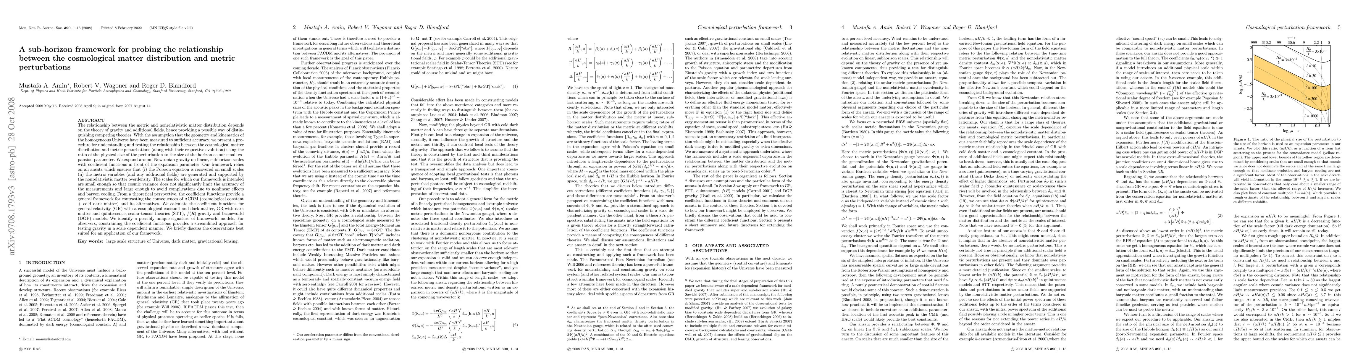 The relationship between the metric and nonrelativistic matter distribution depends on the theory of gravity and additional fields, providing a possible way of distinguishing competing theories. With the assumption that the geometry and kinematics of the homogeneous universe have been measured to sufficient accuracy, we present a procedure for understanding and testing the relationship between the cosmological matter distribution and metric perturbations (along with their respective evolution) using the ratio of the physical size of the perturbation to the size of the horizon as our small expansion parameter. We expand around Newtonian gravity on linear, subhorizon scales with coefficient functions in front of the expansion parameter. Our framework relies on an ansatz which ensures that (i) the Poisson equation is recovered on small scales (ii) the metric variables (and any additional fields) are generated and supported by the nonrelativistic matter overdensity. The scales for which our framework is intended are small enough so that cosmic variance does not significantly limit the accuracy of the measurements and large enough to avoid complications from nonlinear effects and baryon cooling. The coefficient functions provide a general framework for contrasting the consequences of Lambda CDM and its alternatives. We calculate the coefficient functions for general relativity with a cosmological constant and dark matter, GR with dark matter and quintessence, scalar-tensor theories, f(R) gravity and braneworld models. We identify a possibly unique signature of braneworld models. Constraining the coefficient functions provides a streamlined approach for testing gravity in a scale dependent manner. We briefly discuss the observations best suited for an application of our framework.