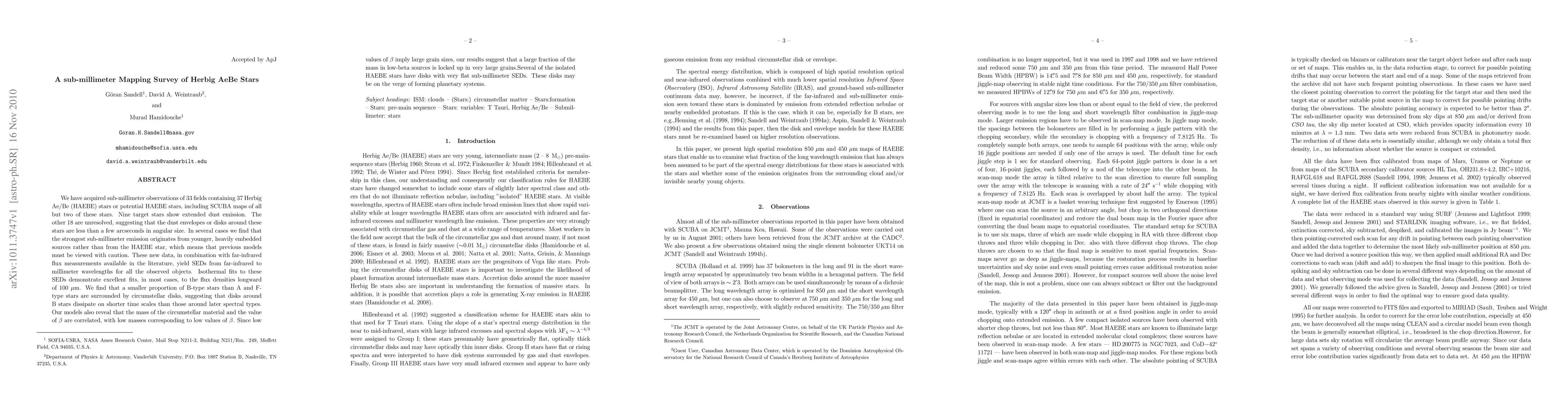 This study presents sub-millimeter observations of 37 Herbig Ae/Be stars, revealing that while some exhibit extended dust emission, others show unresolved dust envelopes, indicating smaller circumstellar disks. The findings suggest that disks around B-type stars dissipate faster than those around A and F-type stars, and that large grains dominate in low-mass circumstellar material.