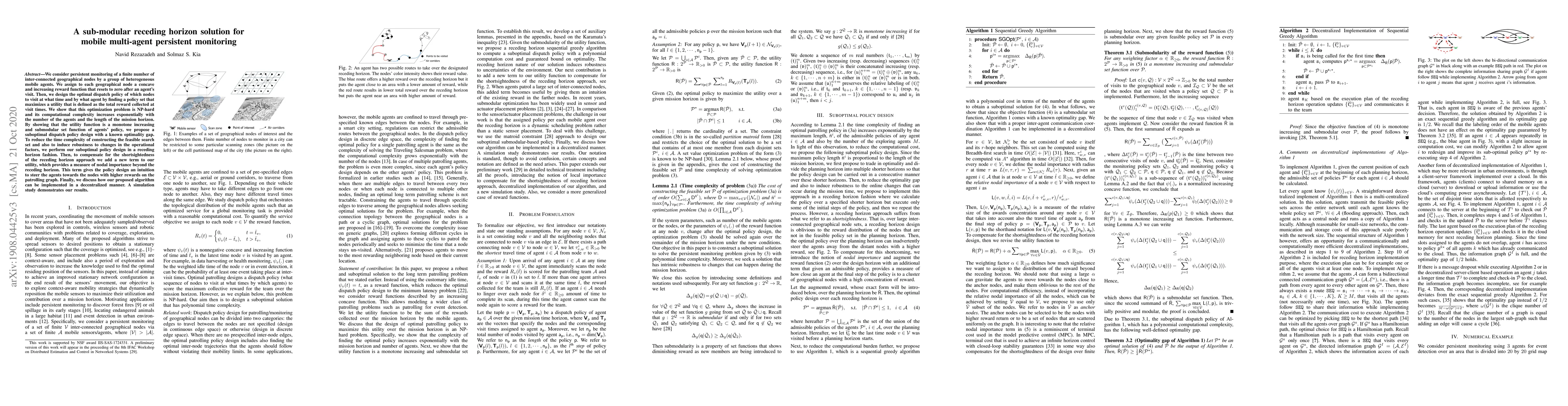 This paper proposes a sub-modular receding horizon approach for optimal dispatch of mobile agents to persistently monitor interconnected geographical nodes. It addresses the NP-hard problem by introducing a utility function that balances immediate rewards with long-term nodal importance, ensuring computational efficiency and robustness.
