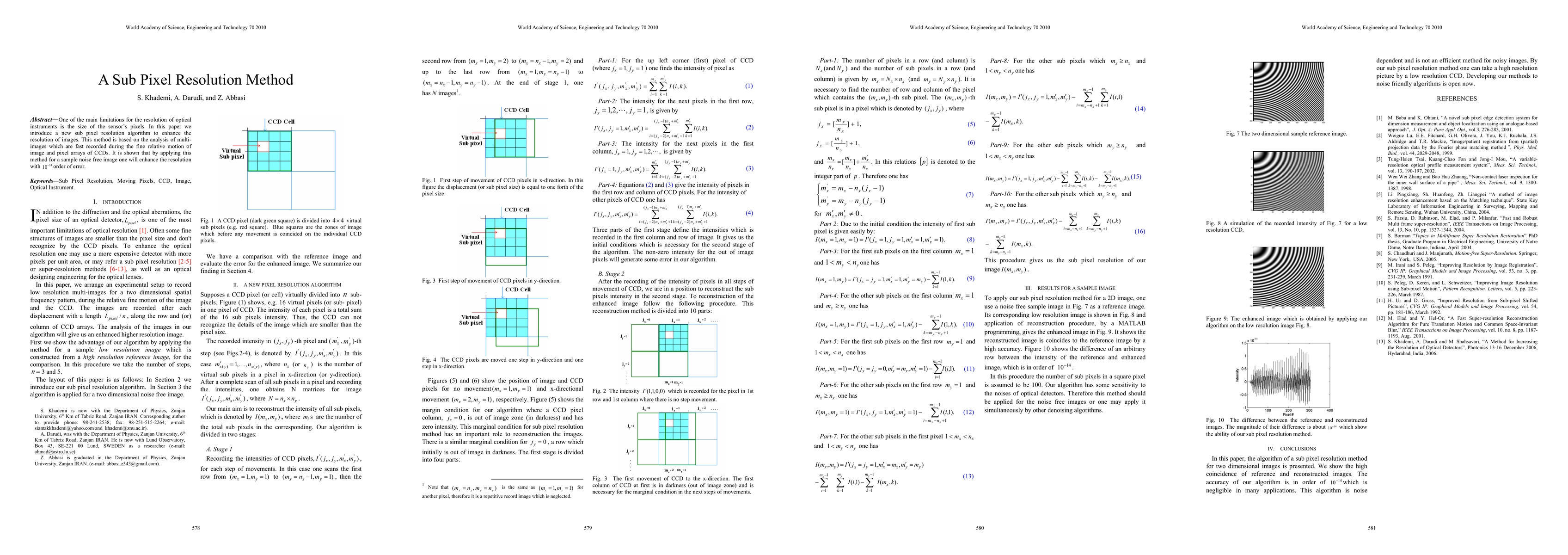 This paper proposes a sub pixel resolution algorithm to improve image resolution by analyzing multiple images captured during the fine relative motion of CCD arrays. The method demonstrates significant resolution enhancement for noise-free images.