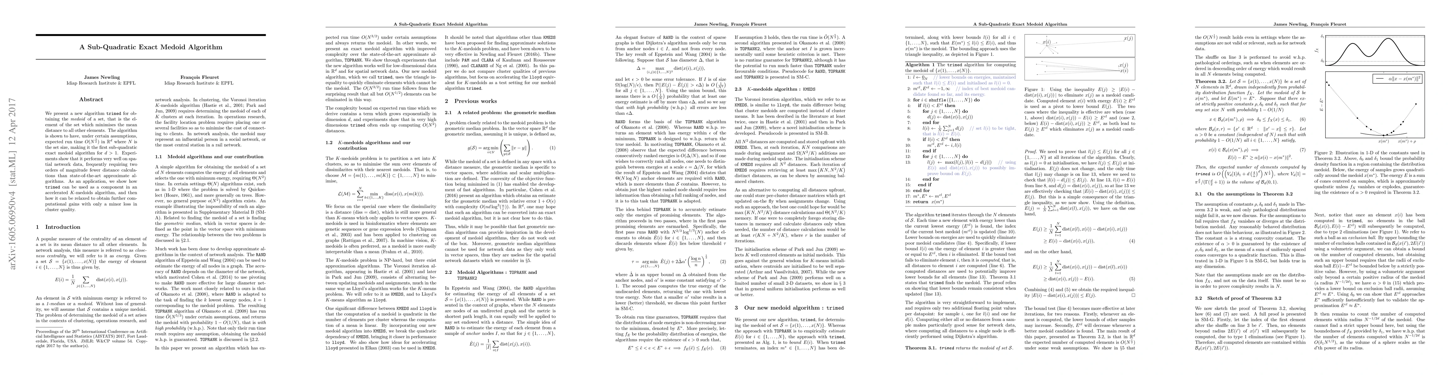 We present a new algorithm, trimed, for obtaining the medoid of a set, that is the element of the set which minimises the mean distance to all other elements. The algorithm is shown to have, under certain assumptions, expected run time O(N^(3/2)) in R^d where N is the set size, making it the first sub-quadratic exact medoid algorithm for d>1. Experiments show that it performs very well on spatial network data, frequently requiring two orders of magnitude fewer distance calculations than state-of-the-art approximate algorithms. As an application, we show how trimed can be used as a component in an accelerated K-medoids algorithm, and then how it can be relaxed to obtain further computational gains with only a minor loss in cluster quality.