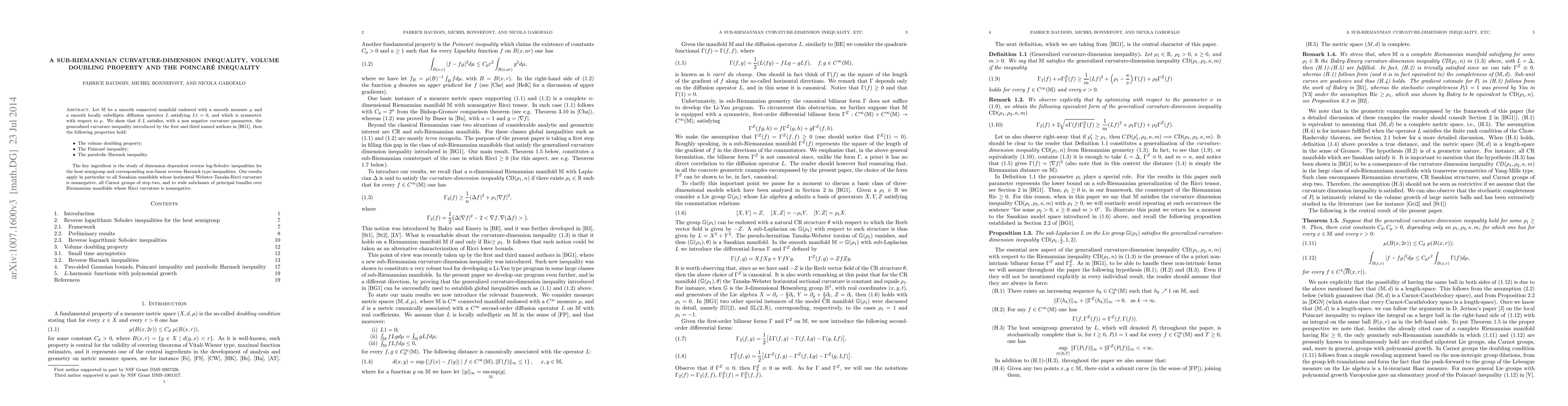 Let $\mathbb{M}$ be a smooth connected manifold endowed with a smooth measure $\mu$ and a smooth locally subelliptic diffusion operator $L$ satisfying $L1=0$, and which is symmetric with respect to $\mu$. We show that if $L$ satisfies, with a non negative curvature parameter, the generalized curvature inequality introduced by the first and third named authors in \cite{BG}, then the following properties hold: 1 The volume doubling property; 2 The Poincar\'e inequality; 3 The parabolic Harnack inequality. The key ingredient is the study of dimensional reverse log-Sobolev inequalities for the heat semigroup and corresponding non-linear reverse Harnack type inequalities. Our results apply in particular to all Sasakian manifolds whose horizontal Webster-Tanaka-Ricci curvature is non negative, all Carnot groups with step two, and to wide subclasses of principal bundles over Riemannian manifolds whose Ricci curvature is non negative.