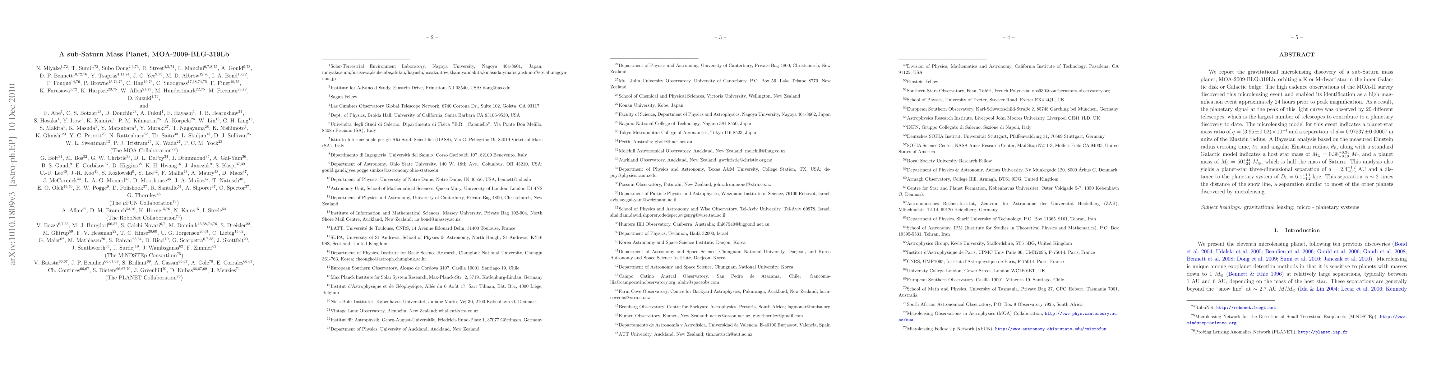 The paper reports the discovery of a sub-Saturn mass planet, MOA-2009-BLG-319Lb, via gravitational microlensing, orbiting a K or M-dwarf star. The planet-star mass ratio is estimated at q = (3.95 +/- 0.02) x 10^{-4}, with the planet being half the mass of Saturn.