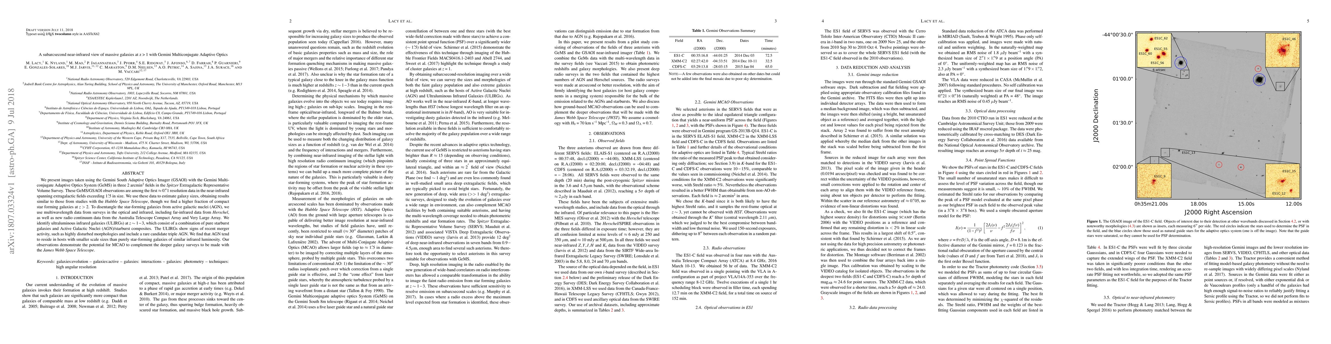 We present images taken using the Gemini South Adaptive Optics Imager (GSAOI) with the Gemini Multiconjugate Adaptive Optics System (GeMS) in three 2 arcmin$^2$ fields in the Spitzer Extragalactic Representative Volume Survey. These GeMS/GSAOI observations are among the first $\approx 0.1^{''}$ resolution data in the near-infrared spanning extragalactic fields exceeding $1.5^{\prime}$ in size. We use these data to estimate galaxy sizes, obtaining results similar to those from studies with the Hubble Space Telescope, though we find a higher fraction of compact star forming galaxies at $z>2$. To disentangle the star-forming galaxies from active galactic nuclei (AGN), we use multiwavelength data from surveys in the optical and infrared, including far-infrared data from Herschel, as well as new radio continuum data from the Australia Telescope Compact Array and Very Large Array. We identify ultraluminous infrared galaxies (ULIRGs) at $z \sim 1-3$, which consist of a combination of pure starburst galaxies and Active Galactic Nuclei (AGN)/starburst composites. The ULIRGs show signs of recent merger activity, such as highly disturbed morphologies and include a rare candidate triple AGN. We find that AGN tend to reside in hosts with smaller scale sizes than purely star-forming galaxies of similar infrared luminosity. Our observations demonstrate the potential for MCAO to complement the deeper galaxy surveys to be made with the James Webb Space Telescope.