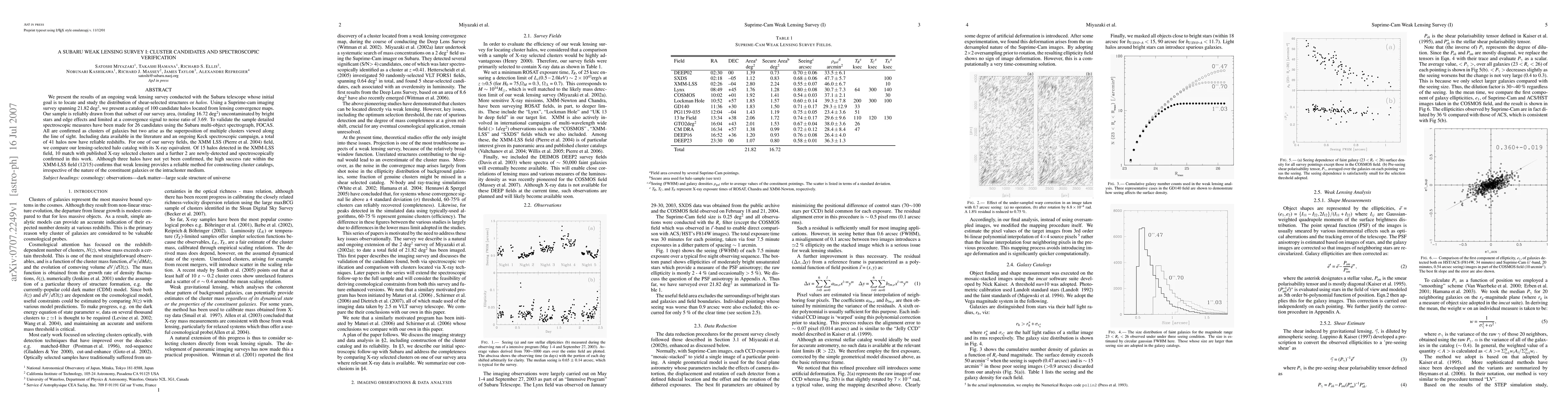 We present the results of an ongoing weak lensing survey conducted with the Subaru telescope whose initial goal is to locate and study the distribution of shear-selected structures or halos. Using a Suprime-cam imaging survey spanning 21.82 square degree, we present a catalog of 100 candidate halos located from lensing convergence maps. Our sample is reliably drawn from that subset of our survey area, (totaling 16.72 square degree) uncontaminated by bright stars and edge effects and limited at a convergence signal to noise ratio of 3.69. To validate the sample detailed spectroscopic measures have been made for 26 candidates using the Subaru multi-object spectrograph, FOCAS. All are confirmed as clusters of galaxies but two arise as the superposition of multiple clusters viewed along the line of sight. Including data available in the literature and an ongoing Keck spectroscopic campaign, a total of 41 halos now have reliable redshifts. For one of our survey fields, the XMM LSS (Pierre et al. 2004) field, we compare our lensing-selected halo catalog with its X-ray equivalent. Of 15 halos detected in the XMM-LSS field, 10 match with published X-ray selected clusters and a further 2 are newly-detected and spectroscopically confirmed in this work. Although three halos have not yet been confirmed, the high success rate within the XMM-LSS field (12/15) confirms that weak lensing provides a reliable method for constructing cluster catalogs, irrespective of the nature of the constituent galaxies or the intracluster medium.