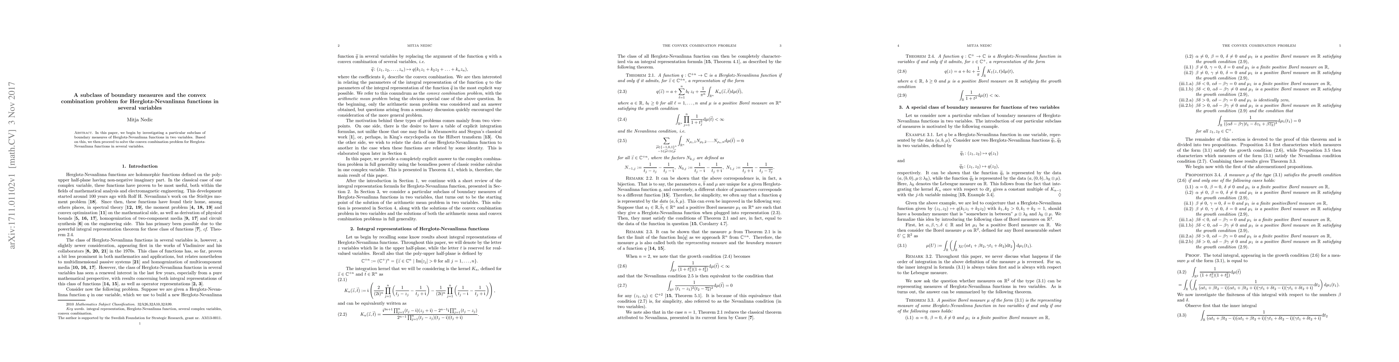 This paper explores a specific subclass of boundary measures for Herglotz-Nevanlinna functions in two variables and uses this foundation to solve the convex combination problem for these functions in multiple dimensions.