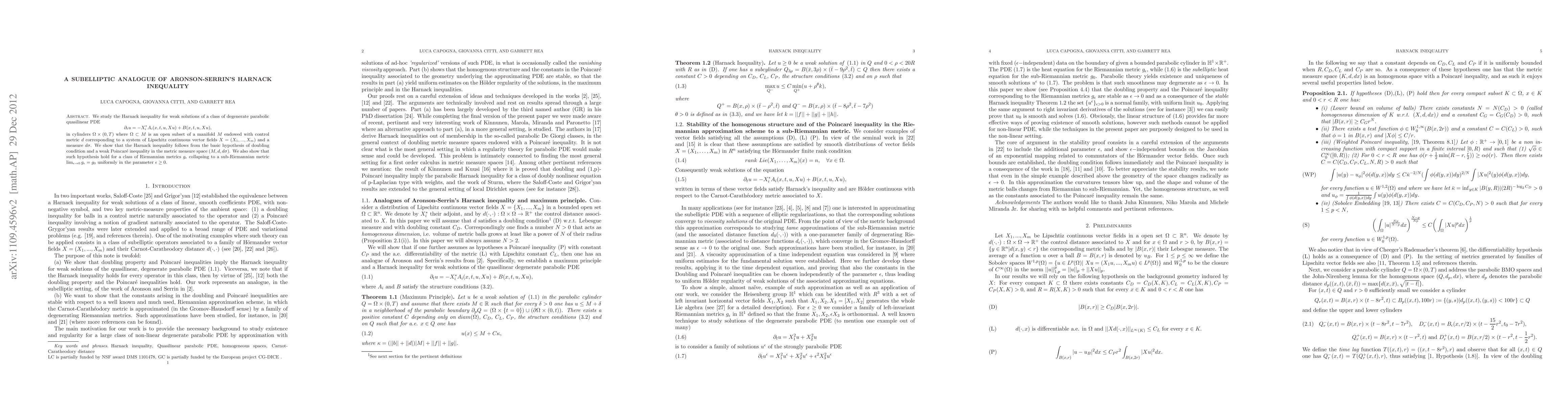 We show that the Harnack inequality for a class of degenerate parabolic quasilinear PDE $$\p_t u=-X_i^* A_i(x,t,u,Xu)+ B(x,t,u,Xu),$$ associated to a system of Lipschitz continuous vector fields $X=(X_1,...,X_m)$ in in $\Om\times (0,T)$ with $\Om \subset M$ an open subset of a manifold $M$ with control metric $d$ corresponding to $X$ and a measure $d\sigma$ follows from the basic hypothesis of doubling condition and a weak Poincar\'e inequality. We also show that such hypothesis hold for a class of Riemannian metrics $g_\e$ collapsing to a sub-Riemannian metric $\lim_{\e\to 0} g_\e=g_0$ uniformly in the parameter $\e\ge 0$.