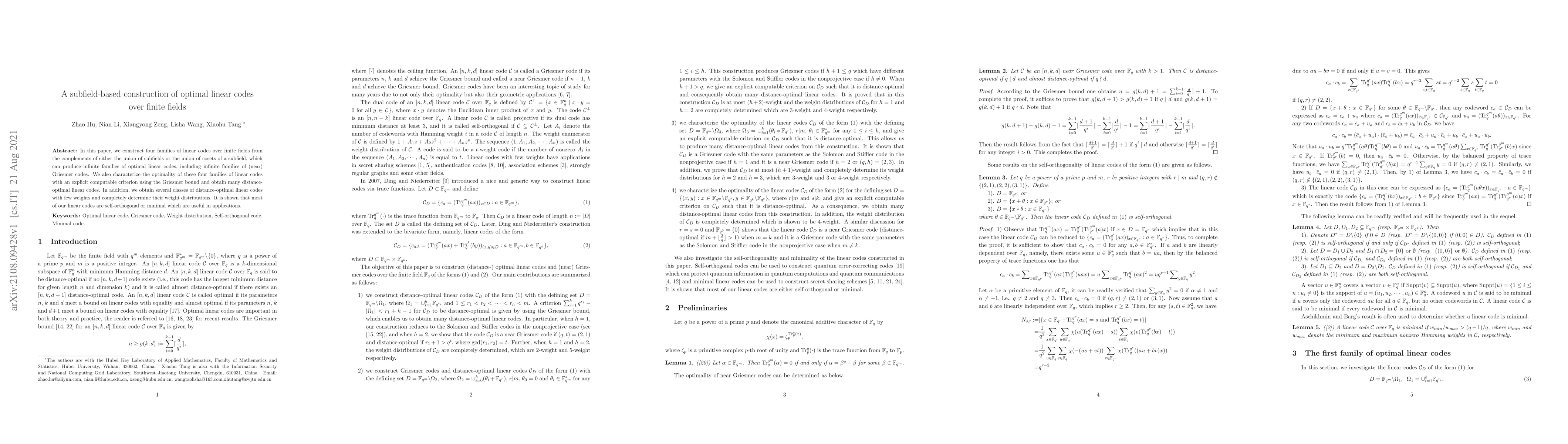 This paper constructs four families of optimal linear codes over finite fields from subfield complements and cosets, achieving infinite families of (near) Griesmer codes. It provides a computable criterion for optimality and identifies several classes of distance-optimal codes with specific weight distributions, many of which are self-orthogonal or minimal.