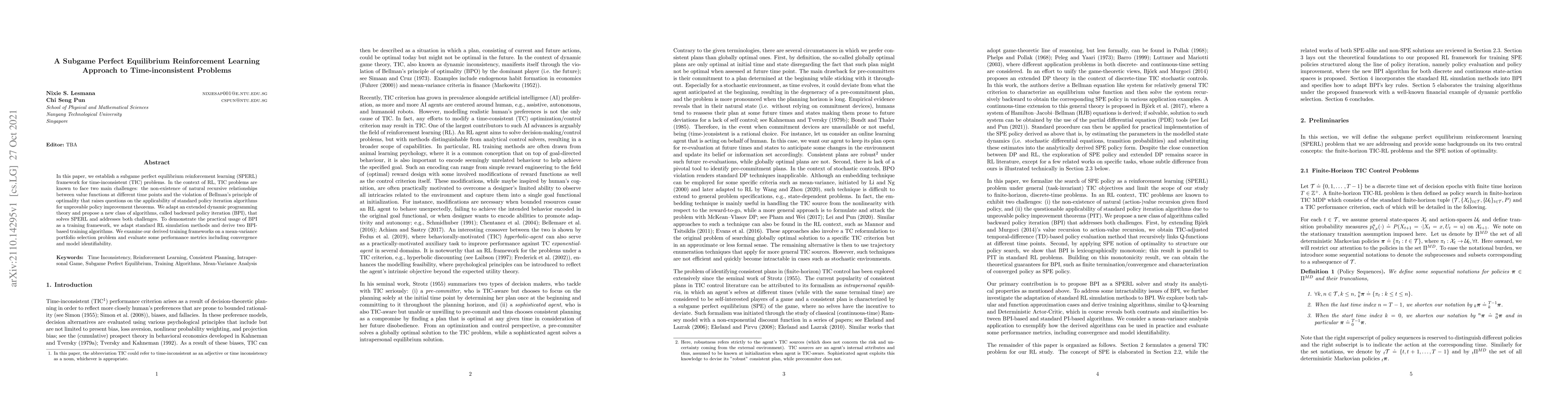 This paper introduces a subgame perfect equilibrium reinforcement learning (SPERL) framework to tackle time-inconsistent problems, proposing a new backward policy iteration (BPI) algorithm to address the challenges of non-recursive value functions and the violation of Bellman's principle. The effectiveness of BPI is demonstrated through two training algorithms applied to a mean-variance portfolio selection problem.