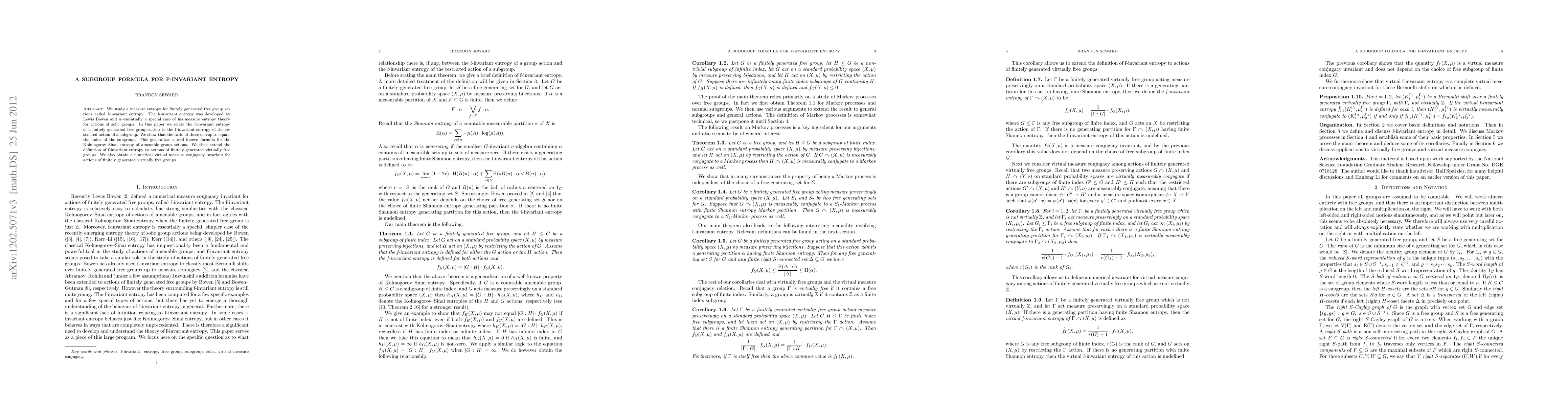This paper develops a subgroup formula for f-invariant entropy in free group actions, showing that the ratio of f-invariant entropies equals the index of the subgroup. It extends the concept to virtually free groups and introduces a new numerical invariant.
