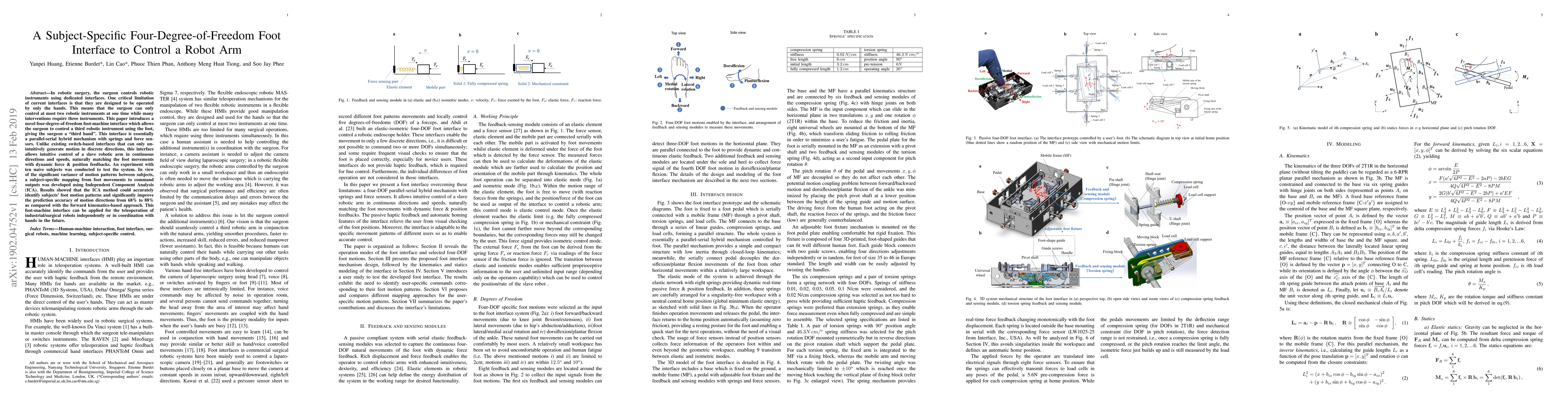 This paper presents a novel four-degree-of-freedom foot interface enabling surgeons to control a third robotic instrument, providing a "third hand" in robotic surgery. The interface offers intuitive continuous control and dynamic feedback, significantly improving motion direction prediction accuracy through subject-specific mapping using Independent Component Analysis.