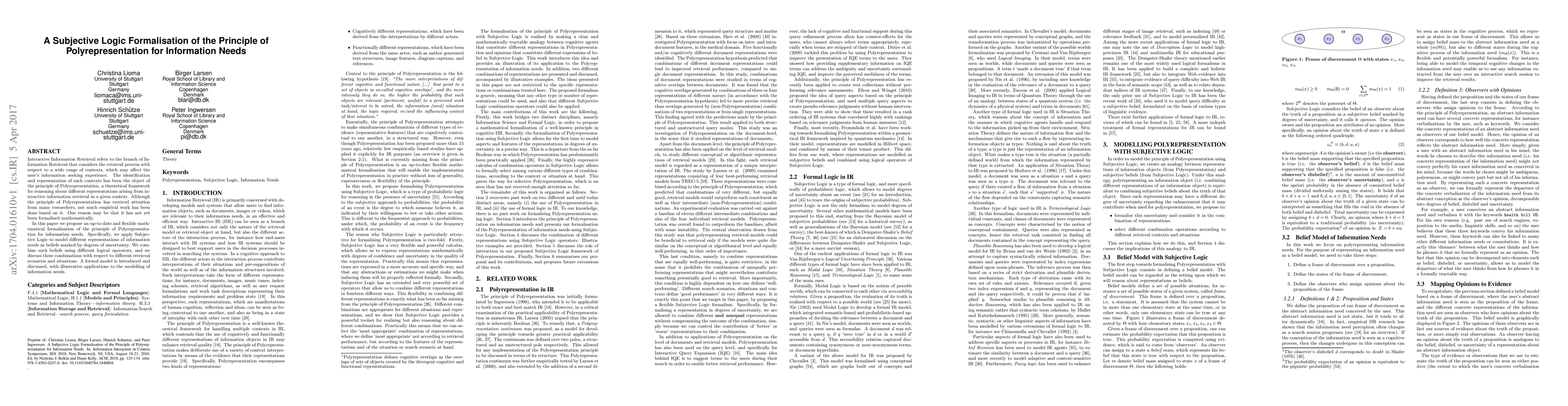 Interactive Information Retrieval refers to the branch of Information Retrieval that considers the retrieval process with respect to a wide range of contexts, which may affect the user's information seeking experience. The identification and representation of such contexts has been the object of the principle of Polyrepresentation, a theoretical framework for reasoning about different representations arising from interactive information retrieval in a given context. Although the principle of Polyrepresentation has received attention from many researchers, not much empirical work has been done based on it. One reason may be that it has not yet been formalised mathematically. In this paper we propose an up-to-date and exible mathematical formalisation of the principle of Polyrepresentation for information needs. Specifically, we apply Subjective Logic to model different representations of information needs as beliefs marked by degrees of uncertainty. We combine such beliefs using different logical operators, and we discuss these combinations with respect to different retrieval scenarios and situations. A formal model is introduced and discussed, with illustrative applications to the modelling of information needs.